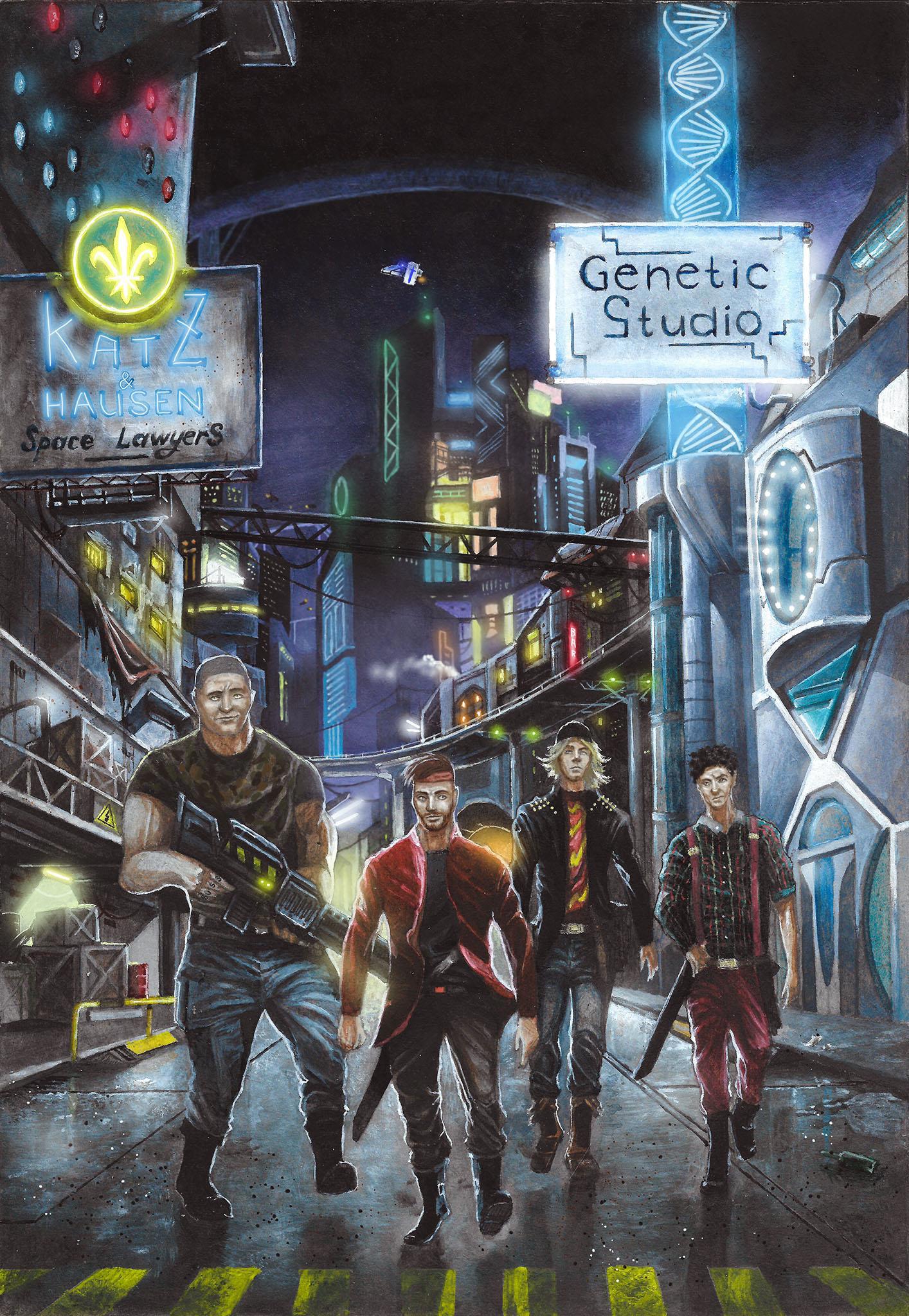 Команда Пикселя на Кровавом Пределе. Иллюстрация к "Тени Одержимого": Макс Мерзляков. Тут тоже есть вывеска "Генетик-Студии", с похожим дизайном, что у Дианы.