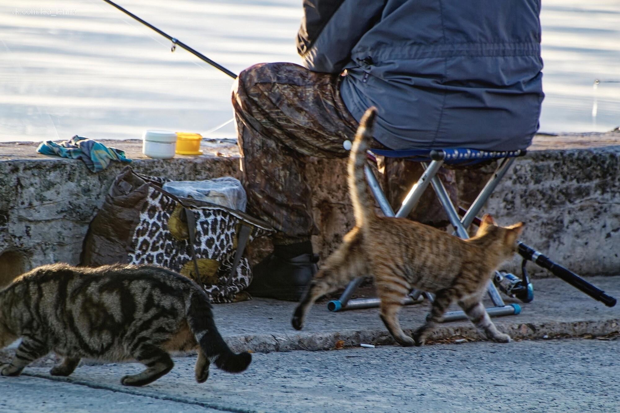 "Набережные" коты, конечно, я их снимаю постоянно. А они так же постоянно приходят из ближайших дворов дежурить рядом с рыбаками. Правильнее было бы с рыболовами, но я никогда особенно не задумывалась о разнице этих двух слов, пока не полезла уточнять значение. И никогда не слышала, чтобы у нас говорили "на набережной - рыболовы", обычно рыбаки и рыбаки... На самом деле это паронимы, почти одинаковые слова, но с разным значением. Рыбак - профессия (хотя при этом судно "рыболовецкое", флот тоже), рыболов - любитель с удочкой. Керчь город рыбацкий и профессионально многие связаны с добычей рыбы, то есть - рыбаки. Так что, чаще и гуще у нас просто используют именно это слово.