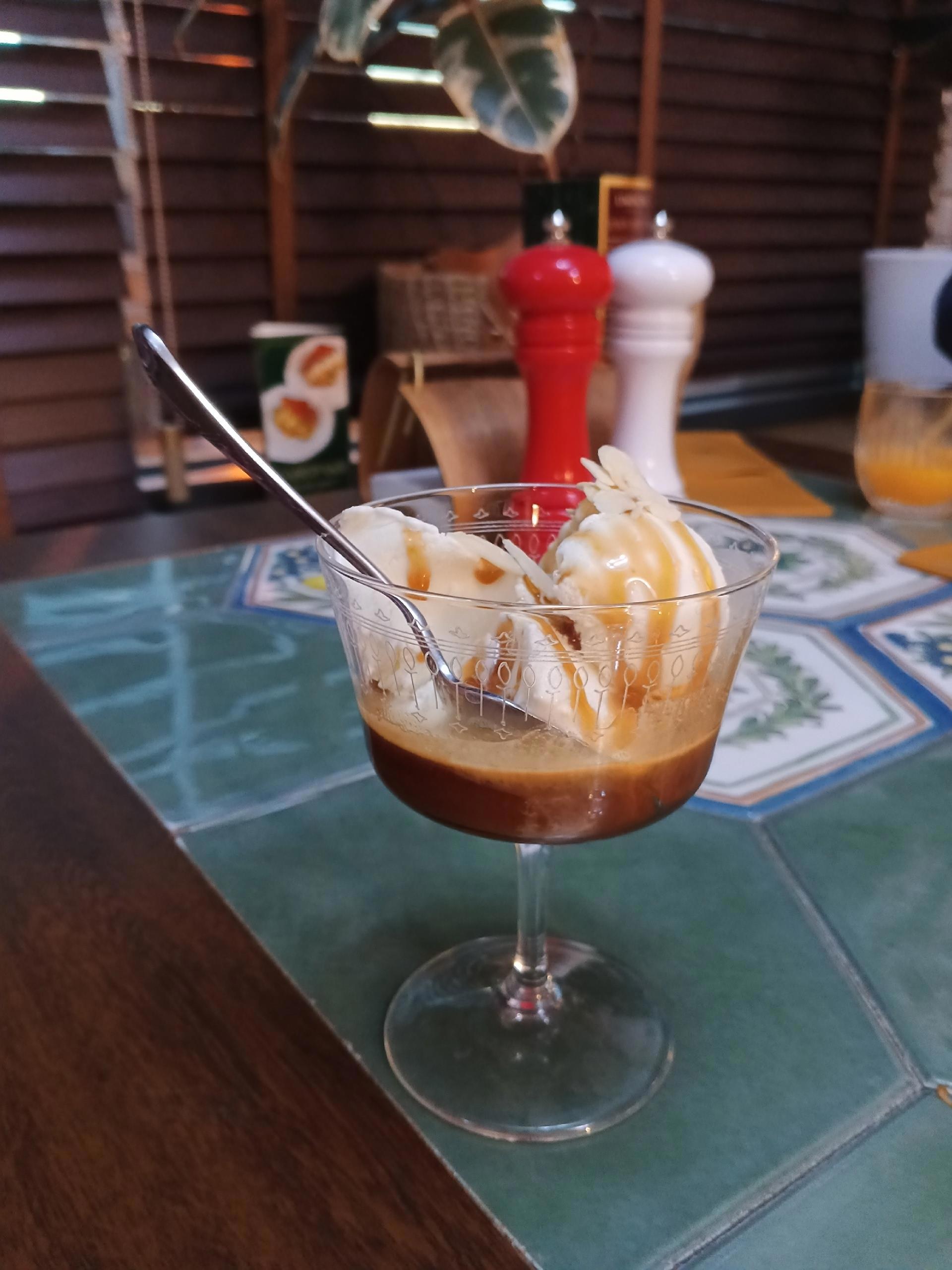 Ну и десерт. Сами понимаете. На десерт у нас были: кофе гляссе, тирамису, капучино и десерт состоящий из мороженного, банана, шоколадного топпинга и кофе. В мороженое кладут фрукты, поливают топпингом, заливают кофе и получается десерт немыслимой прелести и божественного вкуса.