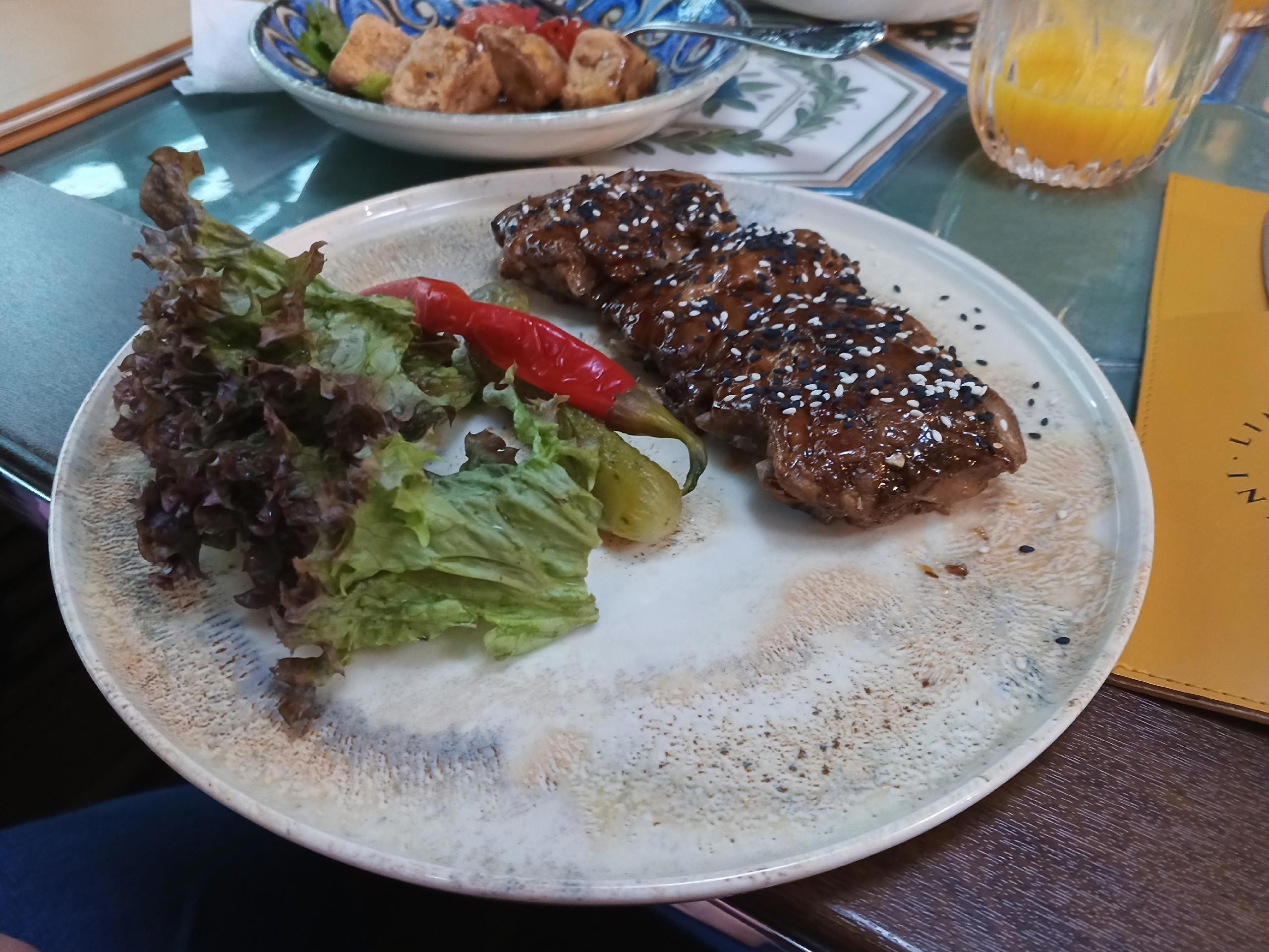 Сами блюда очень понравились. Очень вкусные, порции не маленькие. Что ещё понравилось, так именно то, что порция не огромная, когда не знаешь, как её доесть, но достаточная, чтобы покушать, получить удовольствие и насытиться без переедания.