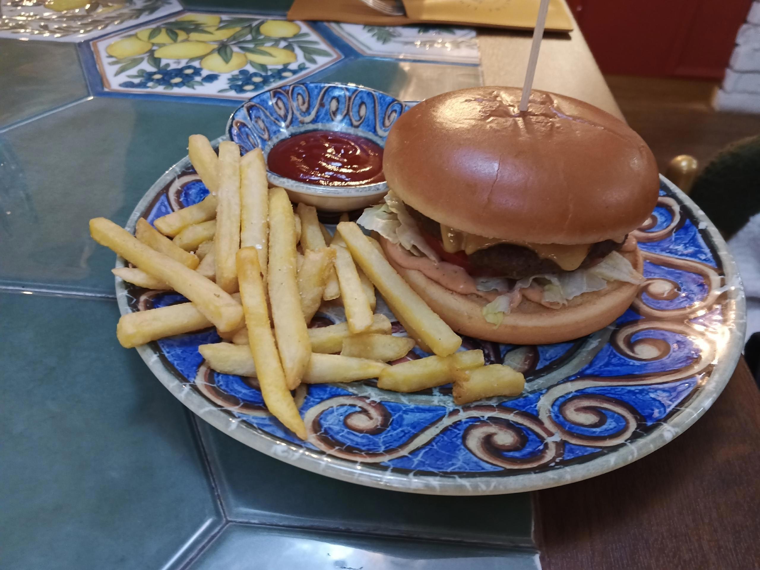 Бургер заказал сын. Слава пробует бургеры везде, где оказывается. Этот его разочаровал. Как сказал сынище: "Обычный. Да ещё и булка не на месте испечена, а из обычной булочной..." Здесь мы уже хохотали в голос. А он добавил, что наелся, всё сбалансировано, но он ожидал какой-то изюминки... В общем, в следующий раз он здесь будет брать мясо.