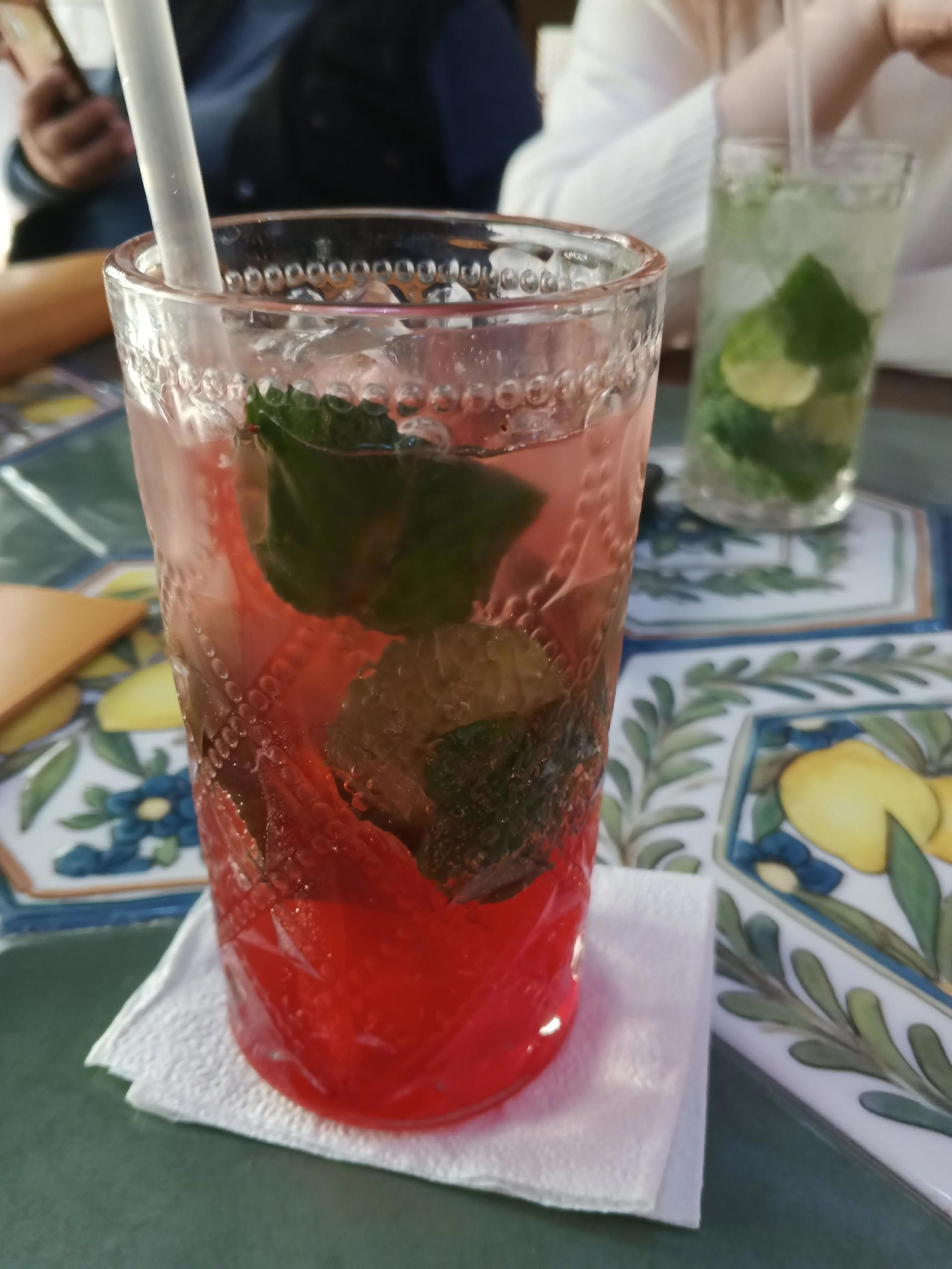Также мы заказали напитки. Поскольку мы с Сергеем не пьём, Слава тоже не употребляет, папуля с Женей за рулём, то самыми пьющими оказались Оля с бабушкой. они, как и положено дамам, заказали домашнюю настойку из смородины. Настоечка выглядела так аппетитно, что даже Слава, я и Женя слегка пригубили. Ответственно заявляю: "Вкусно и, практически не ощущается алкоголь". Остальные напитки: апельсиновый фрэш (Женя с Сергеем), клубничный и классический безалкогольный мохито (я и папа), яблочный сок (Слава), вода питьевая для мамули.