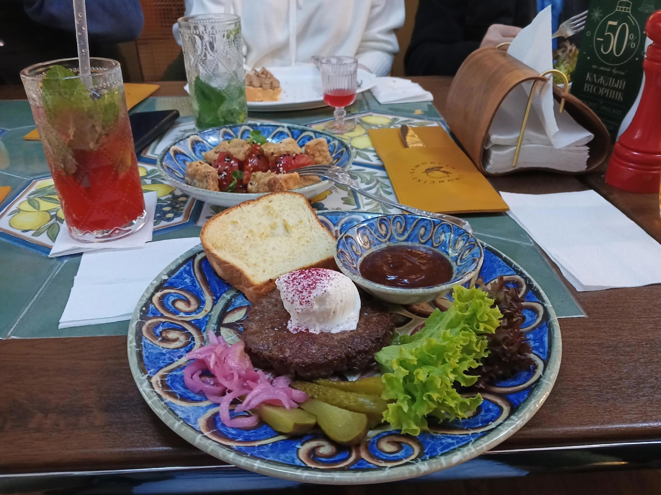 Рубленный бифштекс с яйцом пашот, маринованным луком, солёными огурчиками и салатом. Фото Галины Малышевой.