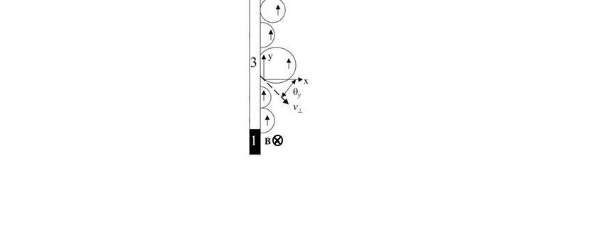 Рис.3. Схема движения электронов от эмиттера 1 к коллектору 2 (снизу вверх) в магнитном поле, направленном вдоль z, перпендикулярно плоскости рисунка, вдоль поверхности диэлектрика 3. Если соединить проводом катод и анод (короткое замыкание, большой ток), разность потенциалов между катодом и анодом равно нулю, электроны, двигаясь по окружности, должны вернуться на поверхность при любом угле вылета qy.