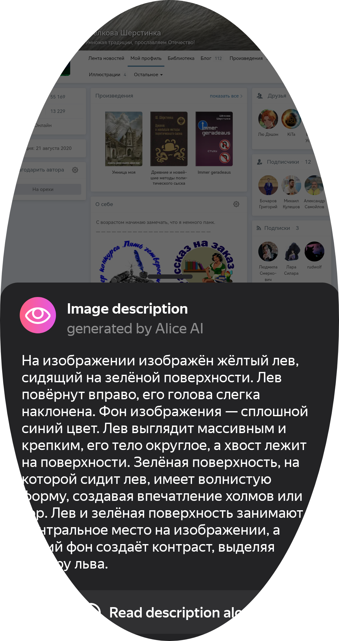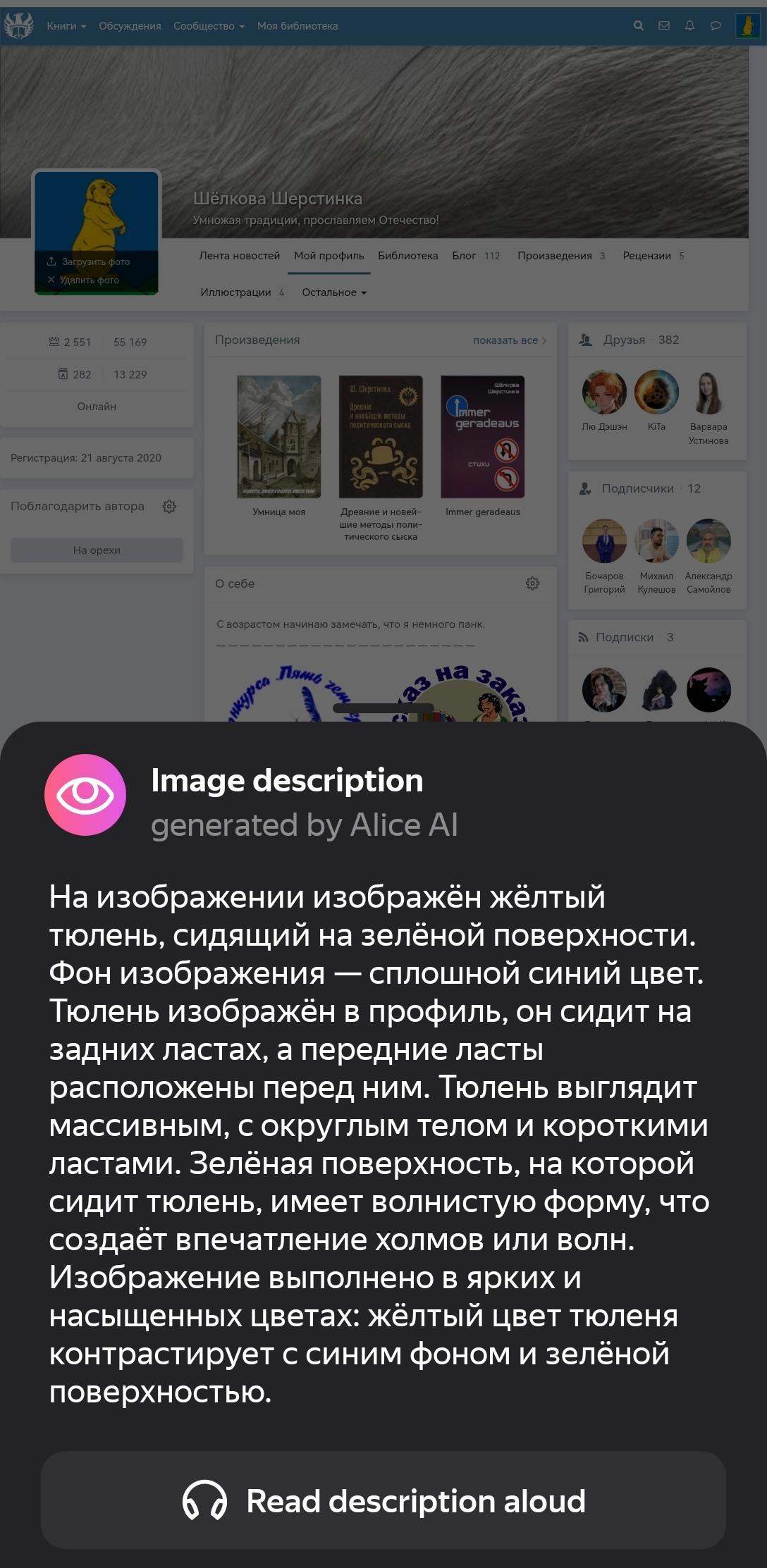 Автор: Шёлкова ШерстинкаУзнала о такой штуке (наверняка всем давным-давно известной): к любой картинке в браузере можно получить описание от искусственного интеллекта. Ну, узнала — и стала играться. Вот что рассказала Алиса о моей аватарке: