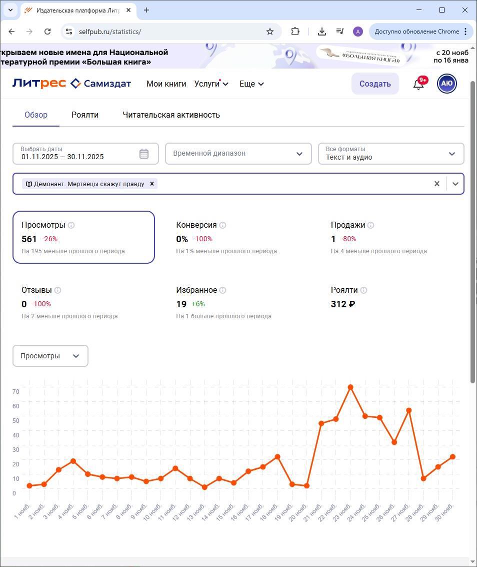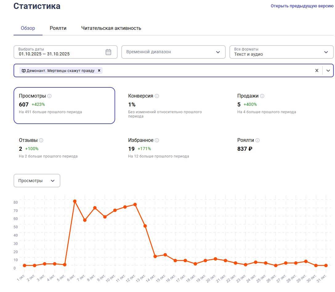 Дальше по самой работе. Баннеры рисовали красивые, даже, наверное, книгу читали, пусть и по диагонали. Потому и не поняли, что это второй том, о чем я им сказал и попросил переделать баннеры. Исправно писали мне о запуске каждой стадии рекламы. Помимо постоянно кидали спамные письма о новых предложениях рекламы и выгодных предложениях с каким-то колоссальными скидками. Но я затаился и ждал результата всего этого продвижения, держа в уме ту самую тысячу проданных книг в бумаге. Такое количество электронок выводило меня в ноль по затратам и окупало вложенные деньги. А теперь смотрим статистику за октябрь:
