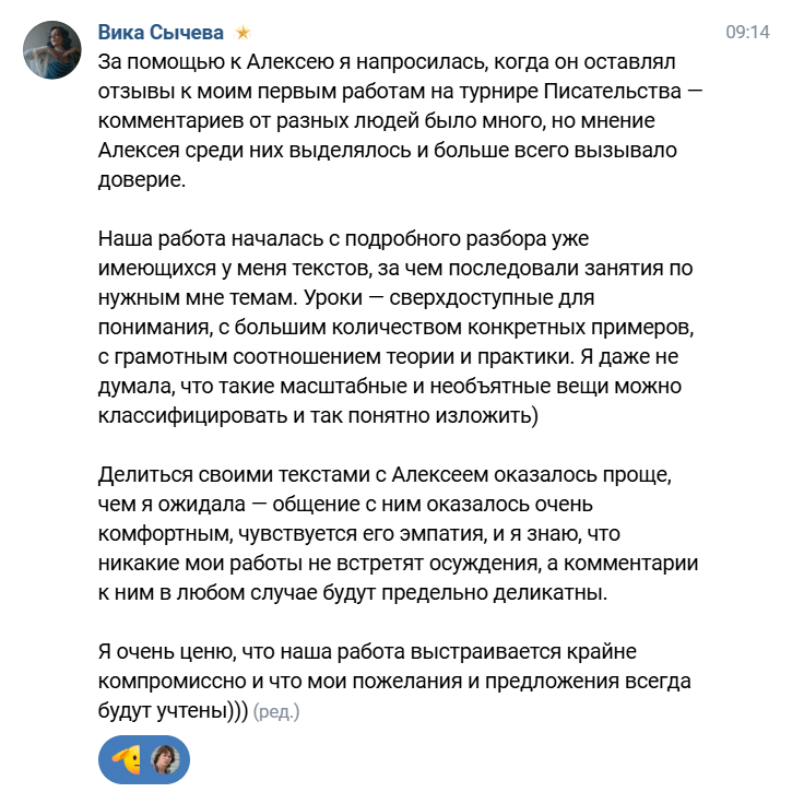 «За помощью к Алексею я напросилась, когда он оставлял отзывы к моим первым работам на турнире Писательства — комментариев от разных людей было много, но мнение Алексея среди них выделялось и больше всего вызывало доверие.