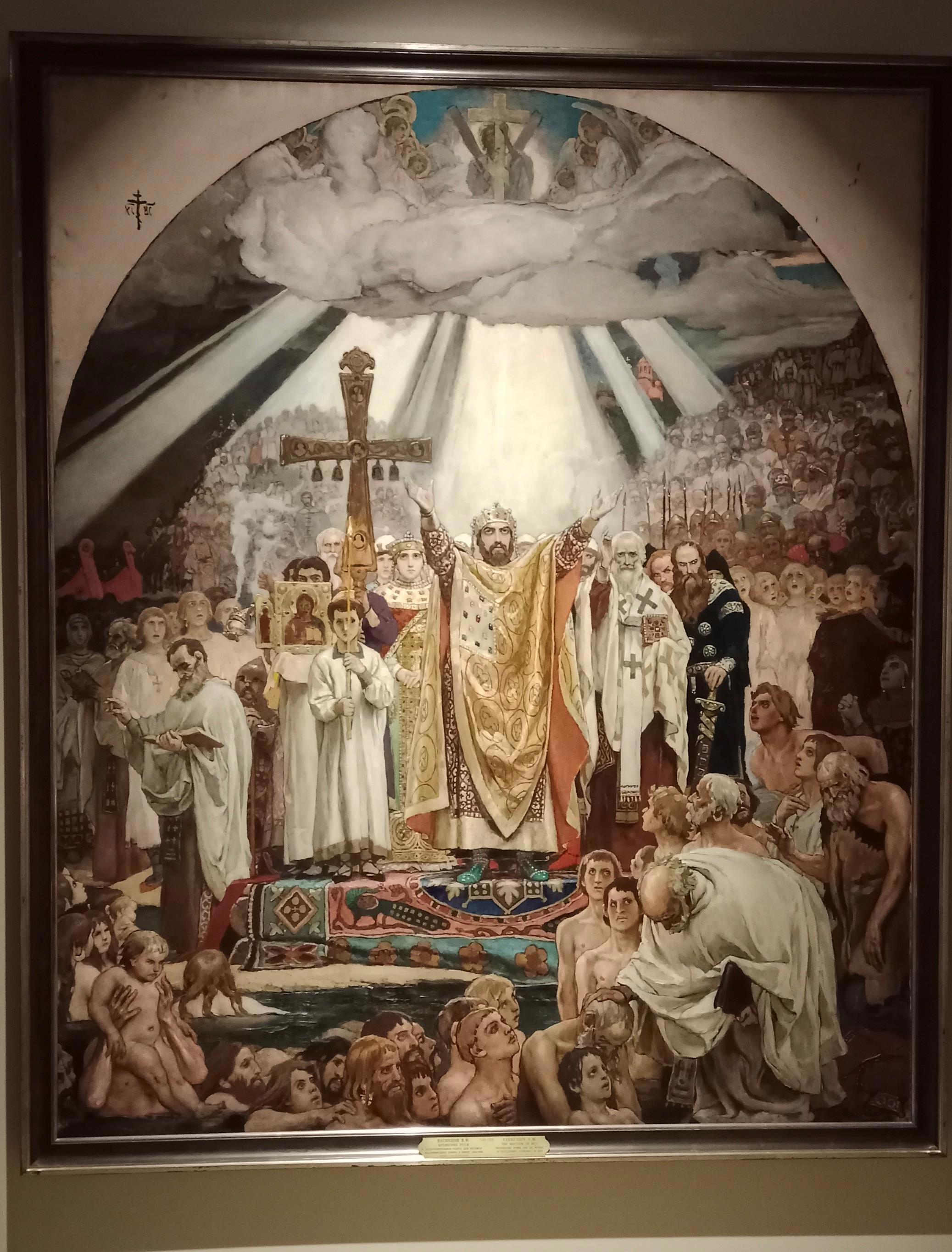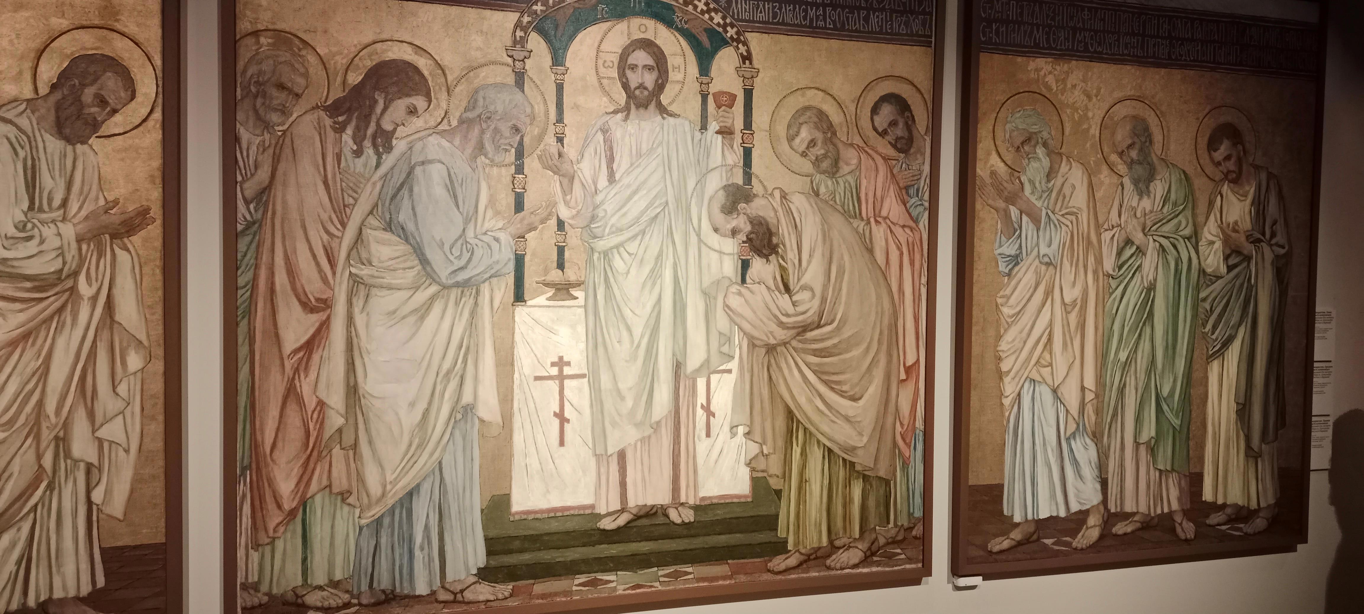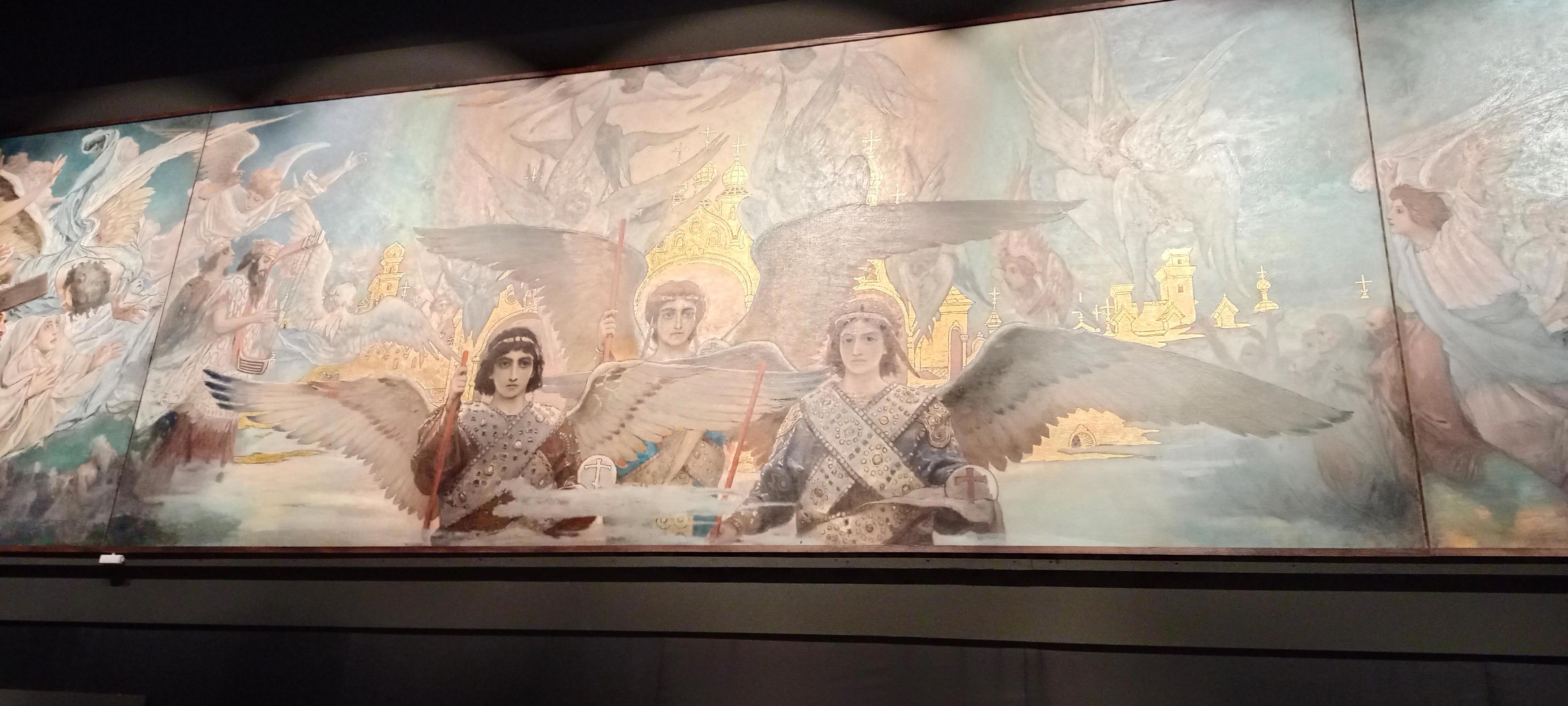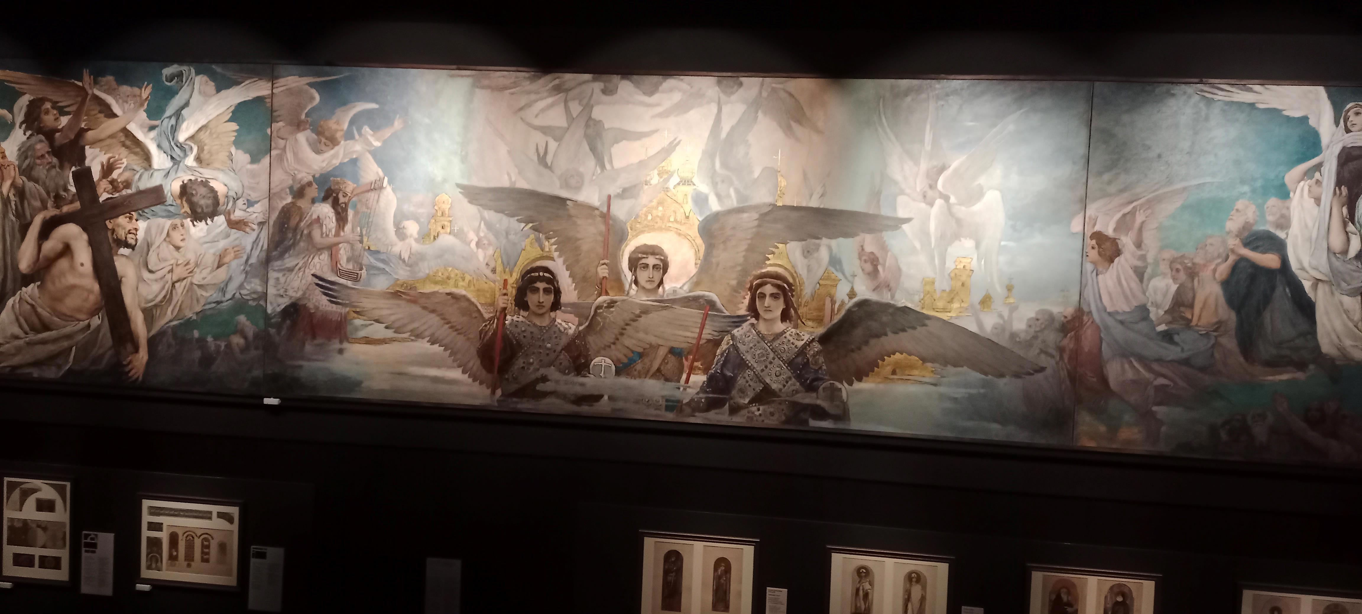 Бо́льшая и самая запоминающаяся часть экспозиции — "картоны" для Владимирского собора в Киеве и для собора Александра Невского в Варшаве. И те, и другие росписи для русского человека сейчас недоступны. Храм в Варшаве снесён пилсудчиками в 1920-е годы, вместе ещё с четырьмя десятками православных храмов польской столицы. Ну а Владимирский собор в Киеве — сами понимаете. Я не знаю точно во владении какой секты он сейчас: то ли секты Епифания, то ли Филарета.