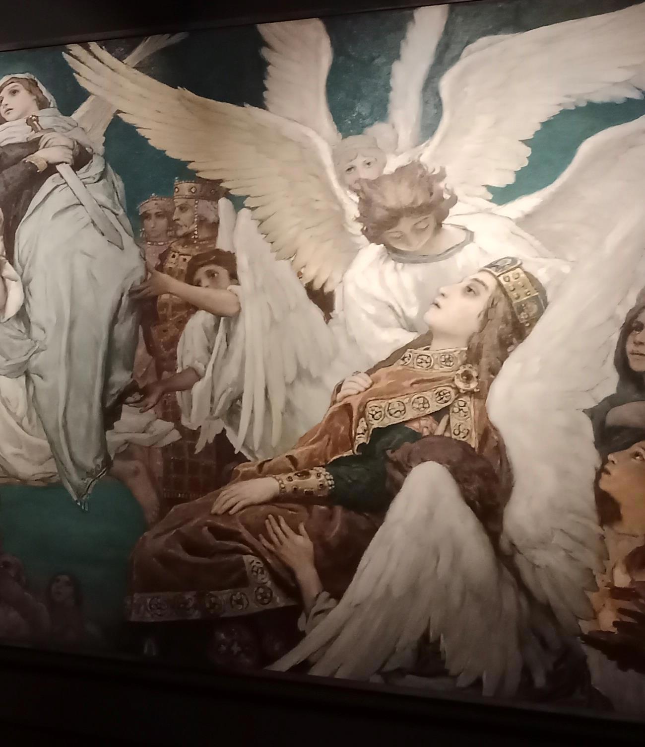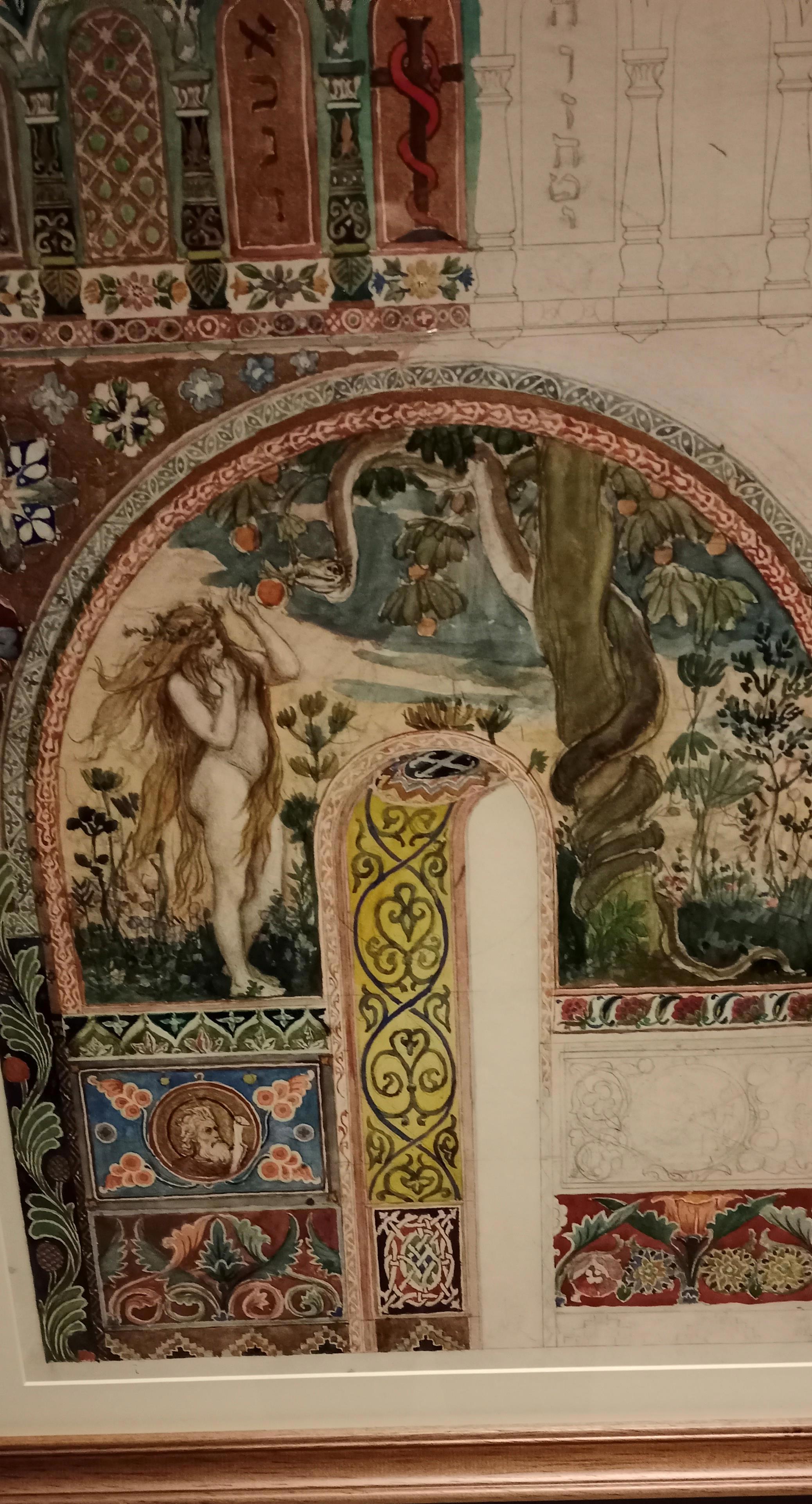 Самая масштабная работа на выставке — 30-метровая роспись "В преддверии рая" (воплощена во Владимирском соборе Киева). Смартфонное фото, понятно, впечатления от этой живописи не передаёт и вся композиция в нем полностью не убирается (не умещается).