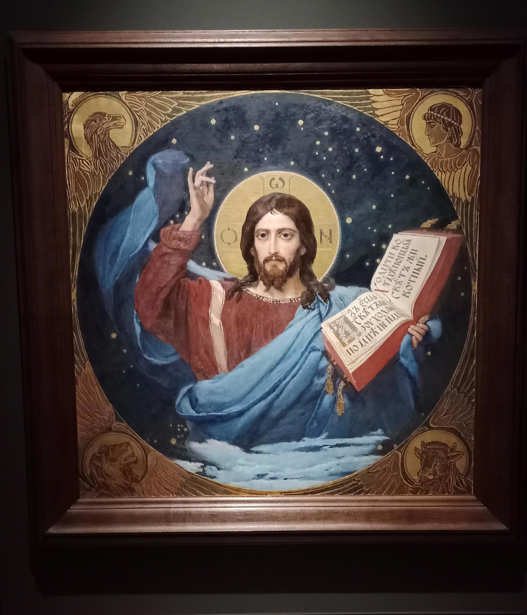 Христос-Вседержитель. В иконописной традиции принято Спаса-Вседержителя писать более суровым и никогда не благословляющим. У Васнецова Он менее суров.