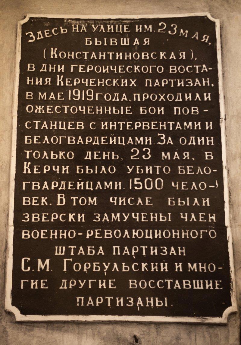 Самое удивительное, что в Керчи эти события никак не освещаются, реконструкций и памятных мероприятий не проводят, хотя есть улица Самойленко, Горбульского и 23 мая. А вот ИСХОД белых из города в 1920 году почему-то регулярно освещают и даже проводят какие-то костюмированные шабаши, ну и памятников натыкали: Врангелю и белым которые дали деру в 1920 году.