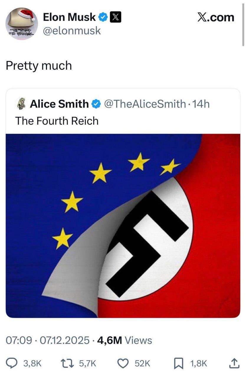 А потом Маск репостнул картинку, где свастика сравнивается с символикой ЕС! С учётом того обстоятельства, что он сам неоднократно демонстративно зиговал - это поддержка ЕС или критика?
