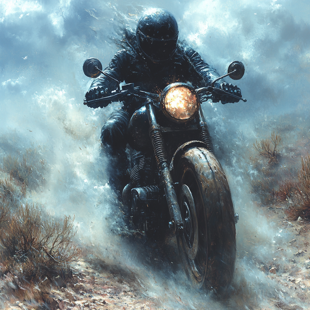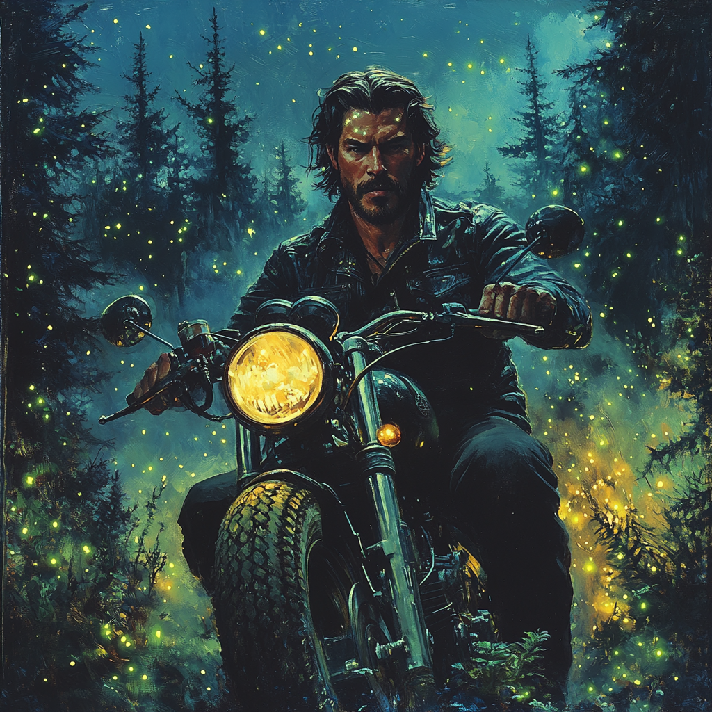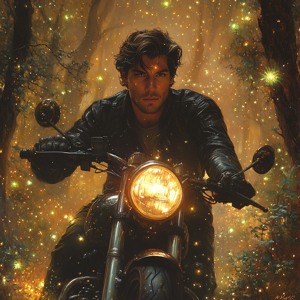Короче, сюжет у меня постоянно меняется, то в одну, то в другую сторону и я сам не знаю, куда он вывернет, но приключений у ГГ будет много, даже чересчур. А вот, что мне нейросеть по обложкам делает, причём пишешь мужчина мотоциклист, а она тебе иногда женское лицо подсовывает.