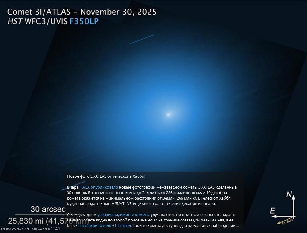 Вчера НАСА опубликовало (https://science.nasa.gov/blogs/3iatlas/2025/12/04/nasas-hubble-space-telescope-revisits-interstellar-comet/) новые фотографии межзвездной кометы 3I/ATLAS, сделанные 30 ноября. В этот момент от кометы до Земли было 286 миллионов км. А 19 декабря комета окажется на минимальном расстоянии от Земли (269 млн км). Телескоп Хаббл будет наблюдать комету 3I/ATLAS еще много раз в течение декабря и января.