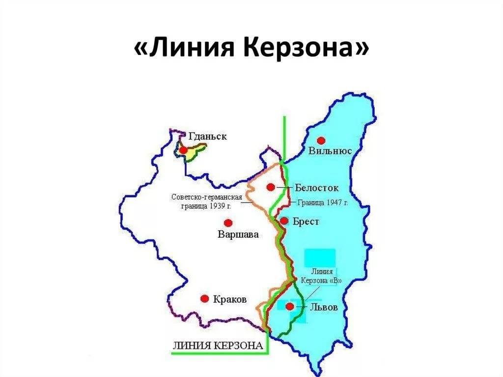 Линия Керзона тянется от Белоруссии до Румынии. Она в основном отделяет католические страны Восточной Европы от православных территорий Белой, Красной и Южной Руси.