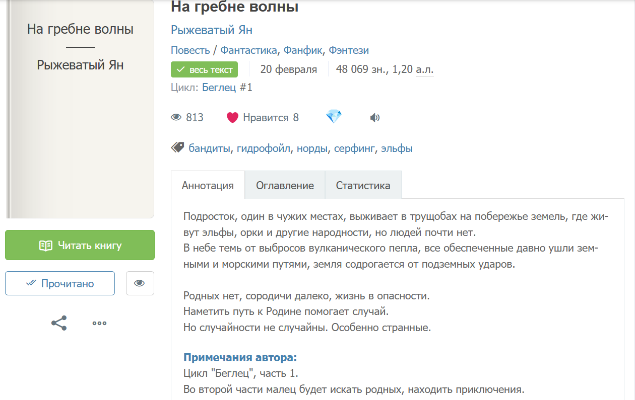 И вот мое предложение "На гребне волны", автор Рыжеватый Ян. Кто-то может сказать, что нечестно во втором всего лишь флешмобном блоге предлагать произведение друга. Честное слово, "полка" забита обещанными к чтению и желанными книгами, просто еле-еле успеваю. Кроме того, у Рыжеватого Яна мне понравился сюжет и исполнение. Резко, графично, временами совсем лаконично. Не всем подобный стиль по душе, да и я не поклонница. Но для характера и условий существования героя в данном случае очень подходит. "Кота в мешке" никогда рекомендовать не буду.