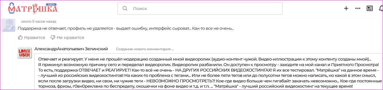 "Отвечает и реагирует. У меня не прошёл модерацию созданный мной видеоролик (аудио-контент чужой. Видео-иллюстрации к этому контенту созданы мной)... Я прикинул возможную причину сего и переделал видеоролик. Видеоролик разбанили. Он доступен к просмотру - заходите на мой канал и Приятного Просмотра! То есть, поддержка ОТВЕЧАЕТ и РЕАГИРУЕТ! Как-то всё не очень - НА ДРУГИХ РОССИЙСКИХ ВИДЕОХОСТИНГАХ! Я их все тестировал. "Матрёшка" на данное время - лучший из российских видеохостингов! На каких-то проблема с тегами... Или не более пяти тегов или до полусотни тегов можно написать, но какой в этом смысл, если после загрузки видео, ни свои, ни чужие теги - НЕВОЗМОЖНО ПРОСМОТРЕТЬ?! Кое-где видео больше чем гигабайт закачать невозможно... Кое-где постоянные тормоза, фризы, г0вн0реклама по беспределу, окошечки на фоне видео и т.д. и т.п. ... "Матрёшка" - лучший российский видеохостинг на текущее время!"