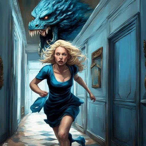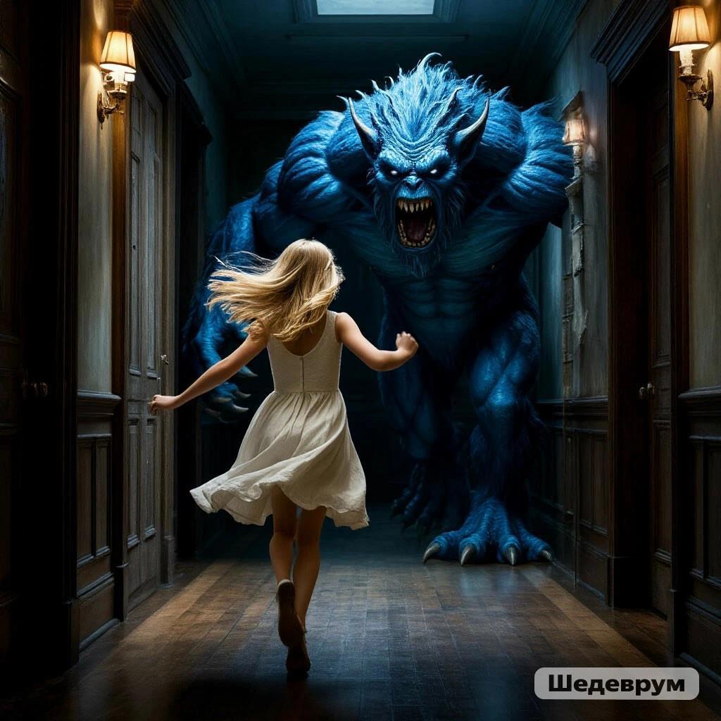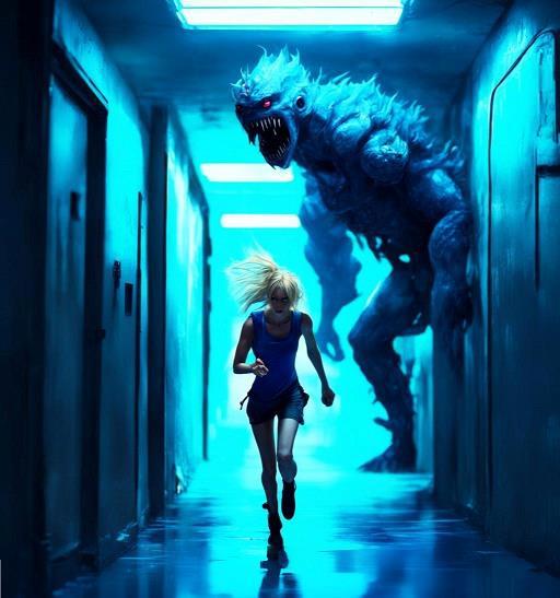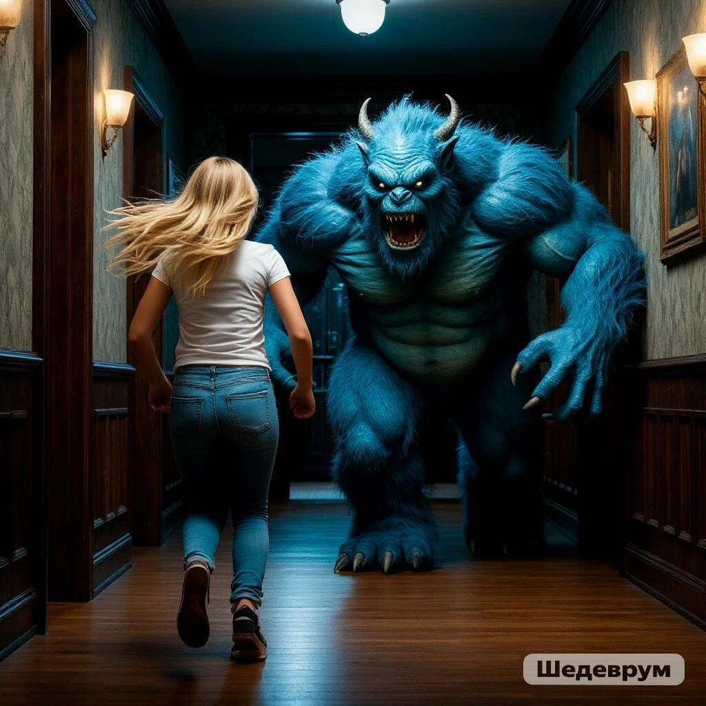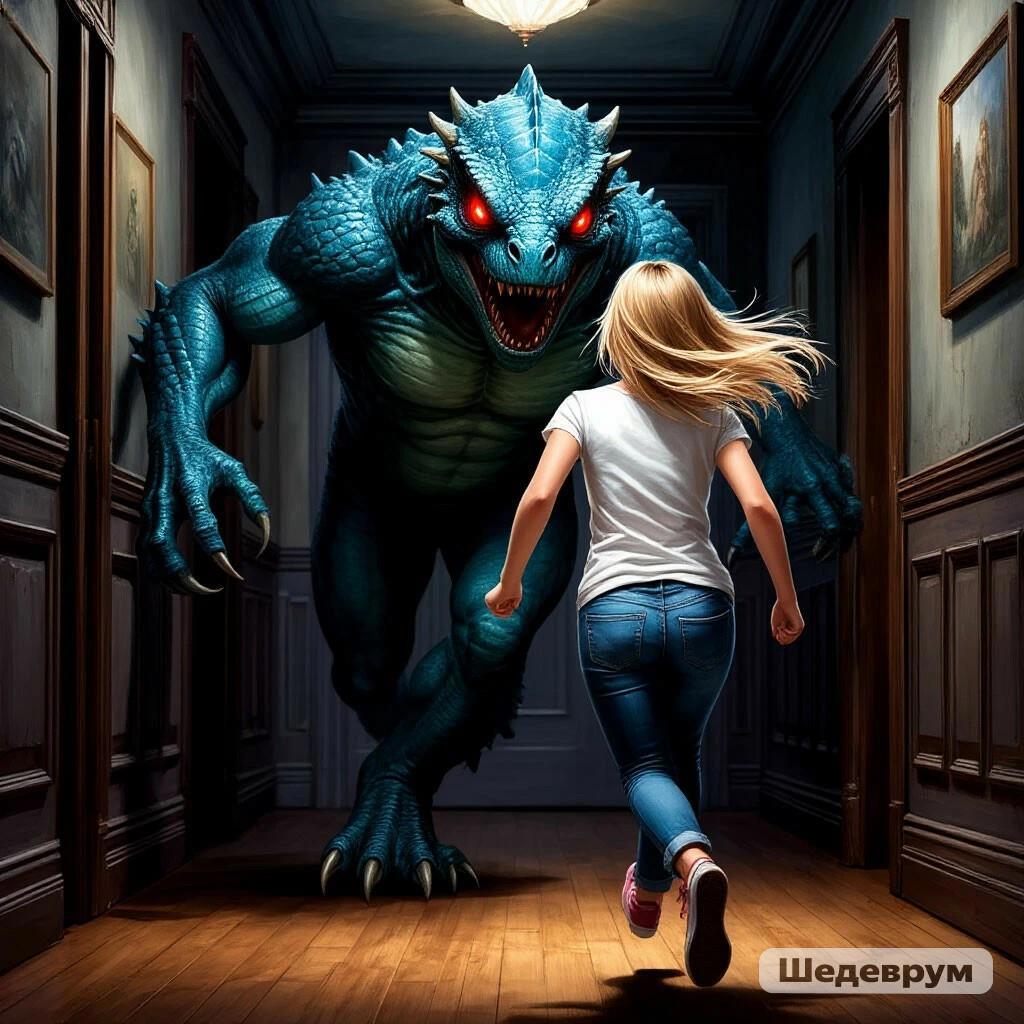 НО (!!!) вот убегать ОТ блондинки он категорически не желал, а со свирепым видом гнался именно ЗА ней, т.е. нейросеть не может даже допустить такой мысли, что именно девушка гонится за монстром, а не он за ней...