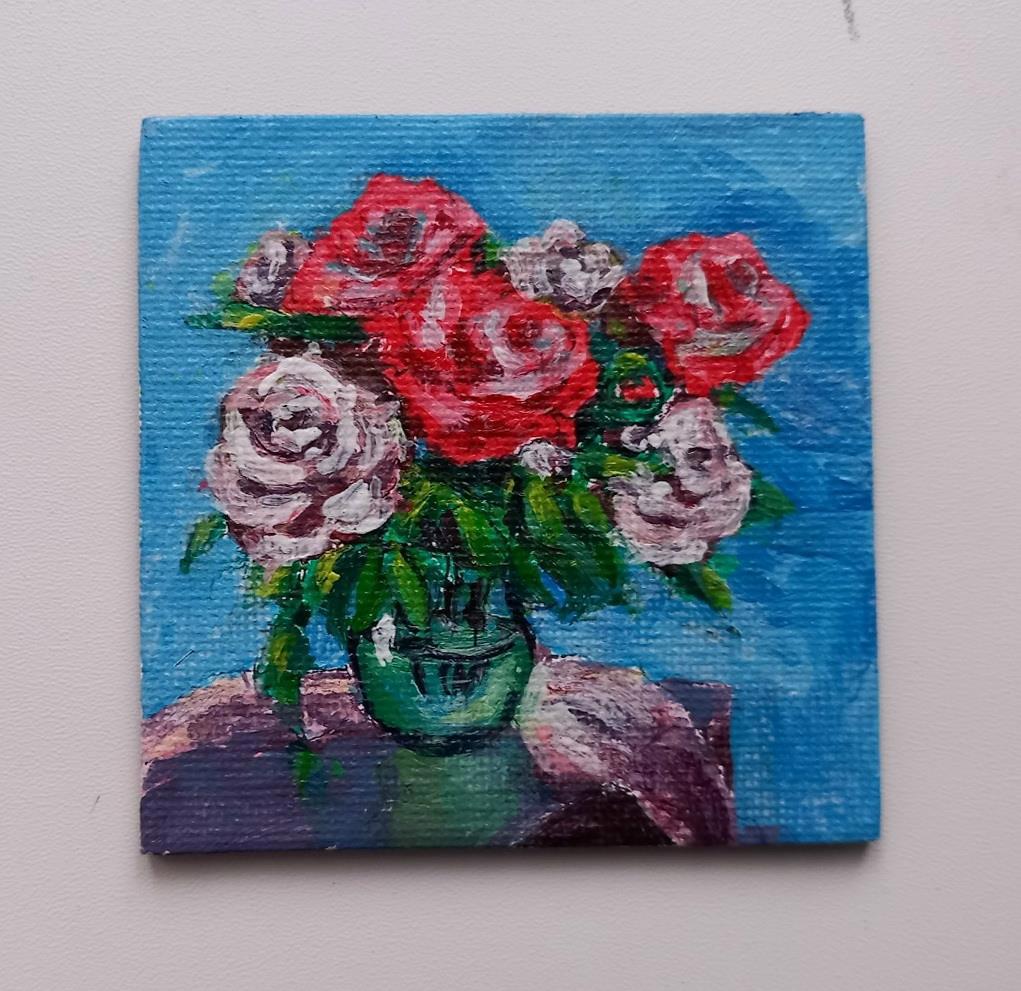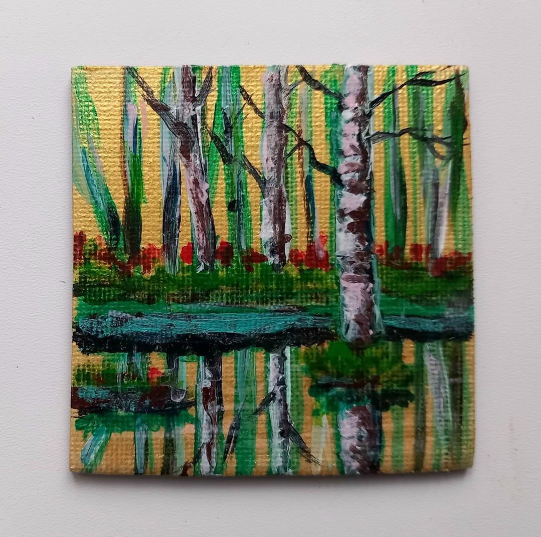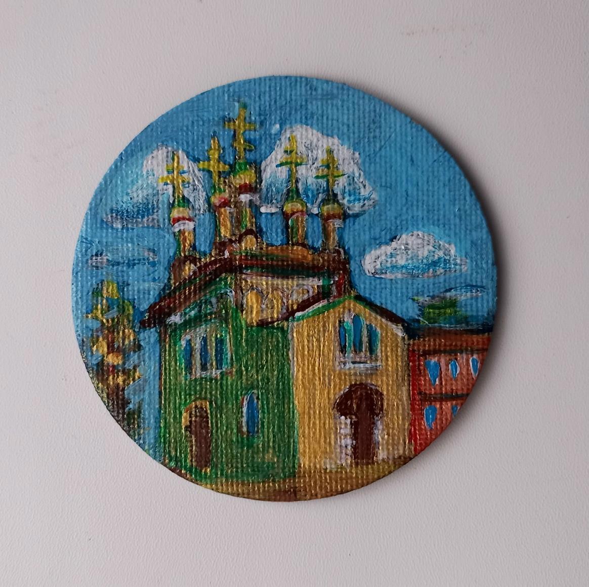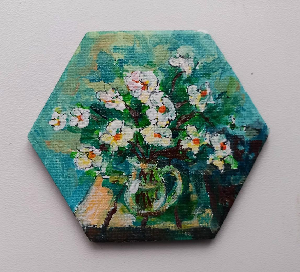 С одной стороны — белый холст на картоне, с другой — сплошной гибкий магнит. Размер — 7,5 х7,5 см.