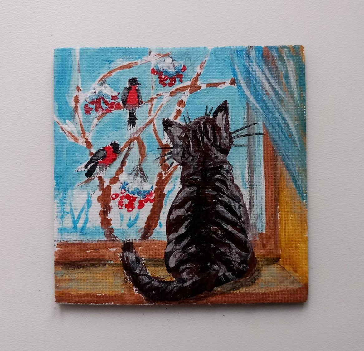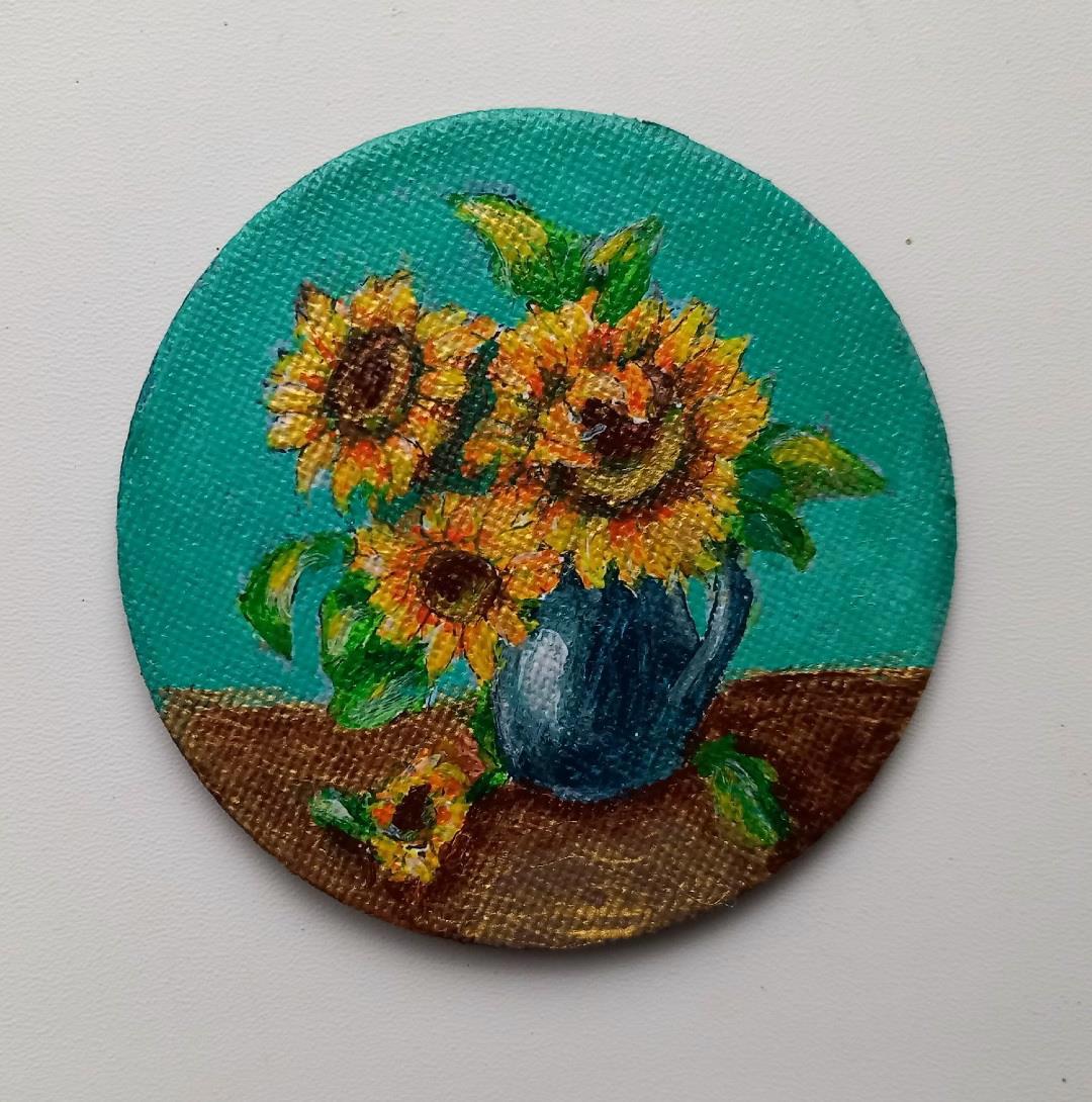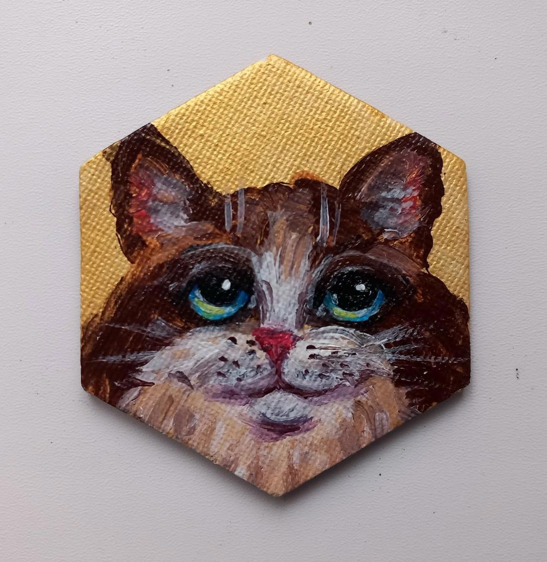 С одной стороны — белый холст на картоне, с другой — сплошной гибкий магнит. Размер — 7,5 х7,5 см.
