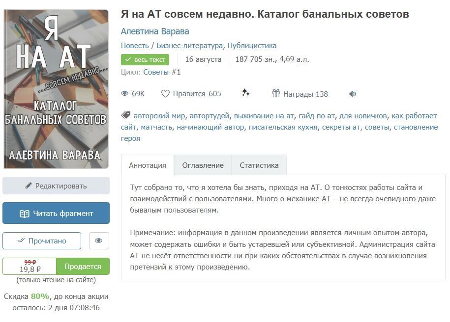 Автор: Алевтина ВараваВ справочнике собран мой опыт работы с платформой АТ. Это ни в коем случае не руководство, как следует писать ваши книги. Это рекомендации на тему того, как вернее размещать ваши книги тут, в особенности, если они – нефоматные.
