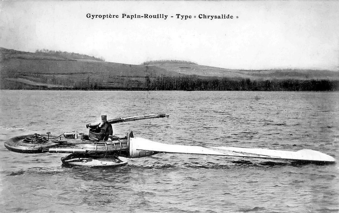 История началась больше ста лет тому назад. В 1910 году французские инженеры Альфонс Папен и Дидье Руилли вдохновившись полётом кленового семечка-вертолётика, создали проект необычного летательного аппарата. А уже в 1911 году военные дали им денег на строительство. Единственная объёмная лопасть этого уникума длиной 17 метров уравновешивалась двигателем «Rhone» мощностью 80 л.с., который вращал вентилятор, нагнетавший воздух в лопасть. На конце лопасти воздух выходил из сопла, раскручивая аппарат. Часть воздуха использовалась для механизма поворота. Необычную конструкцию тогда договорились называть «Gyroptere» (гироптер). А самому аппарату разработчики дали имя «Куколка» (Chrysalide). Вот его фотография во время испытаний: