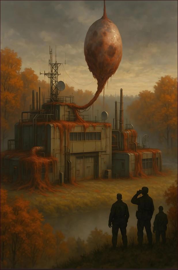Но самым поразительным было не это. Вся территория базы, включая здания, была покрыта красным мхом – не отдельными пятнами, а сплошным ковром пульсирующей, словно живой, субстанции. Она струилась по стенам, затягивала окна, обволакивала антенны на крыше башни. И в центре всего этого, над главным зданием, висело...