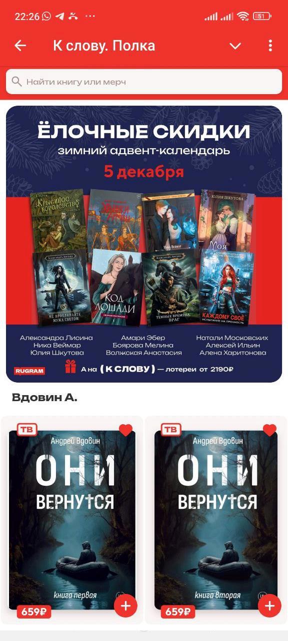 Автор: Андрей ВдовинПусть немного запоздало, но объявляю: на этих выходных в течение 48 часов действует большущая скидка на мой двухтомник "Они вернутся" при заказе через руграмовский Telegram-канал "К СЛОВУ"! Твердый шитый переплет, белая бумага, выборочная лакировка обложки.