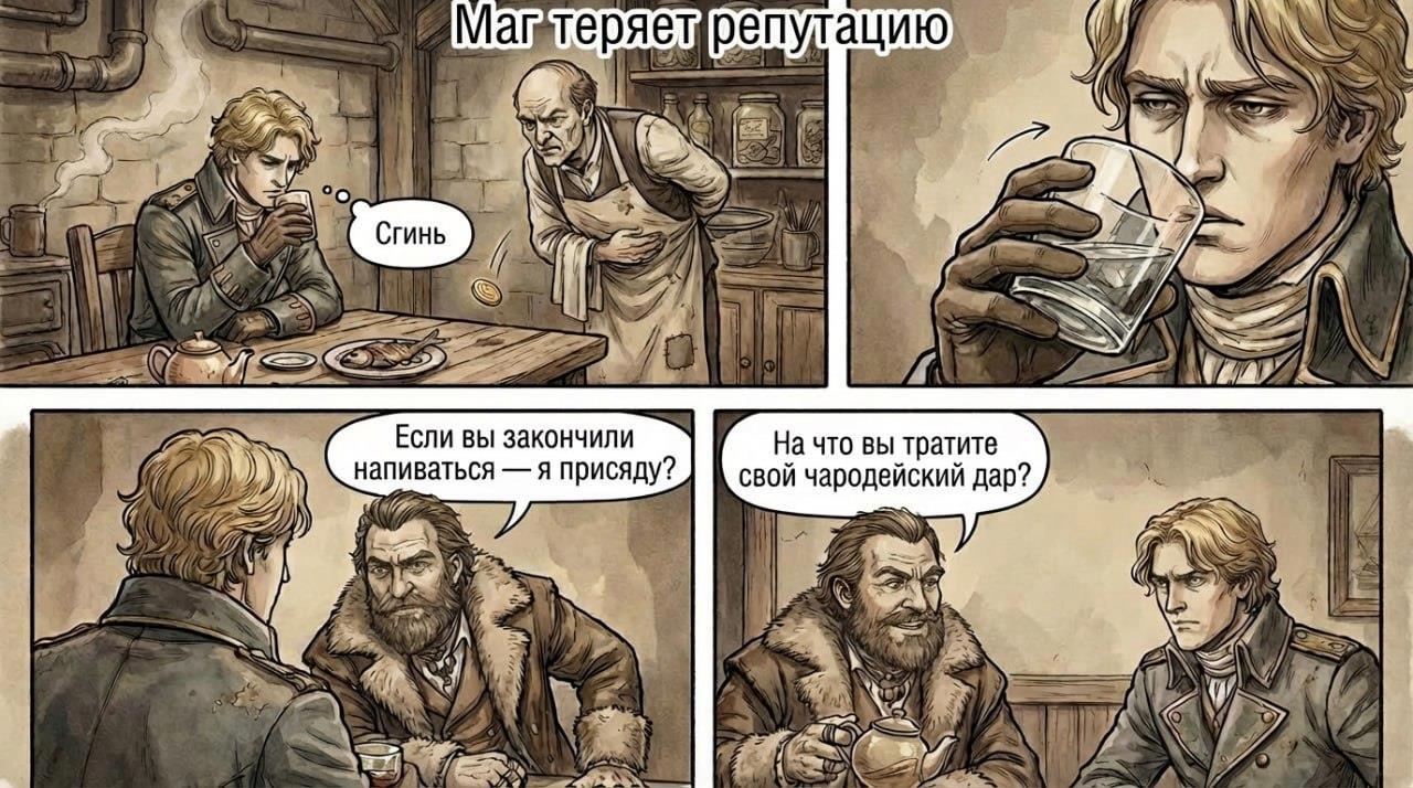 Автор: Валерия ДеминаМуж надавил на нейронку и заставил ее выдать нечто близкое по атмосфере и стилю к начальной главе, которая зовется "Маг теряет репутацию".