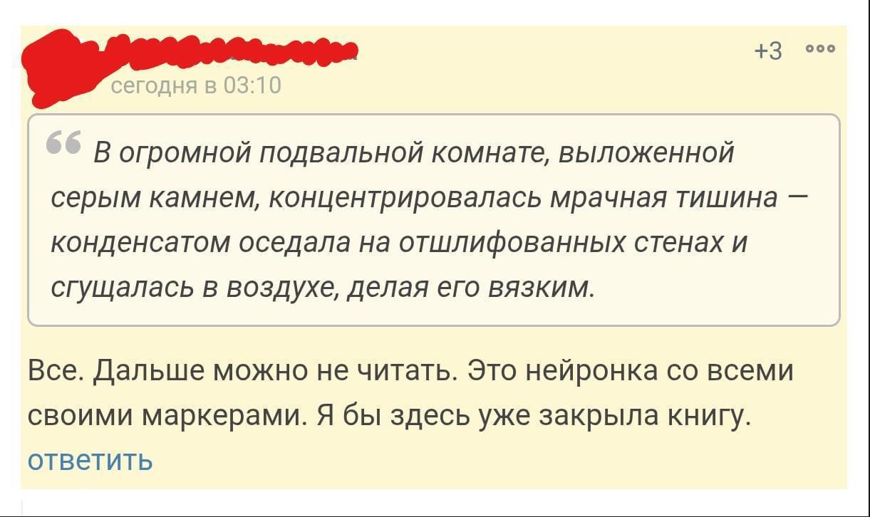 Я прочитала приведенный "обвинителем" отрывок и задумалась. В нейронках и том, как они пишут, я понимаю чуть меньше, чем ничего. Но мне этот отрывок тоже не понравился: