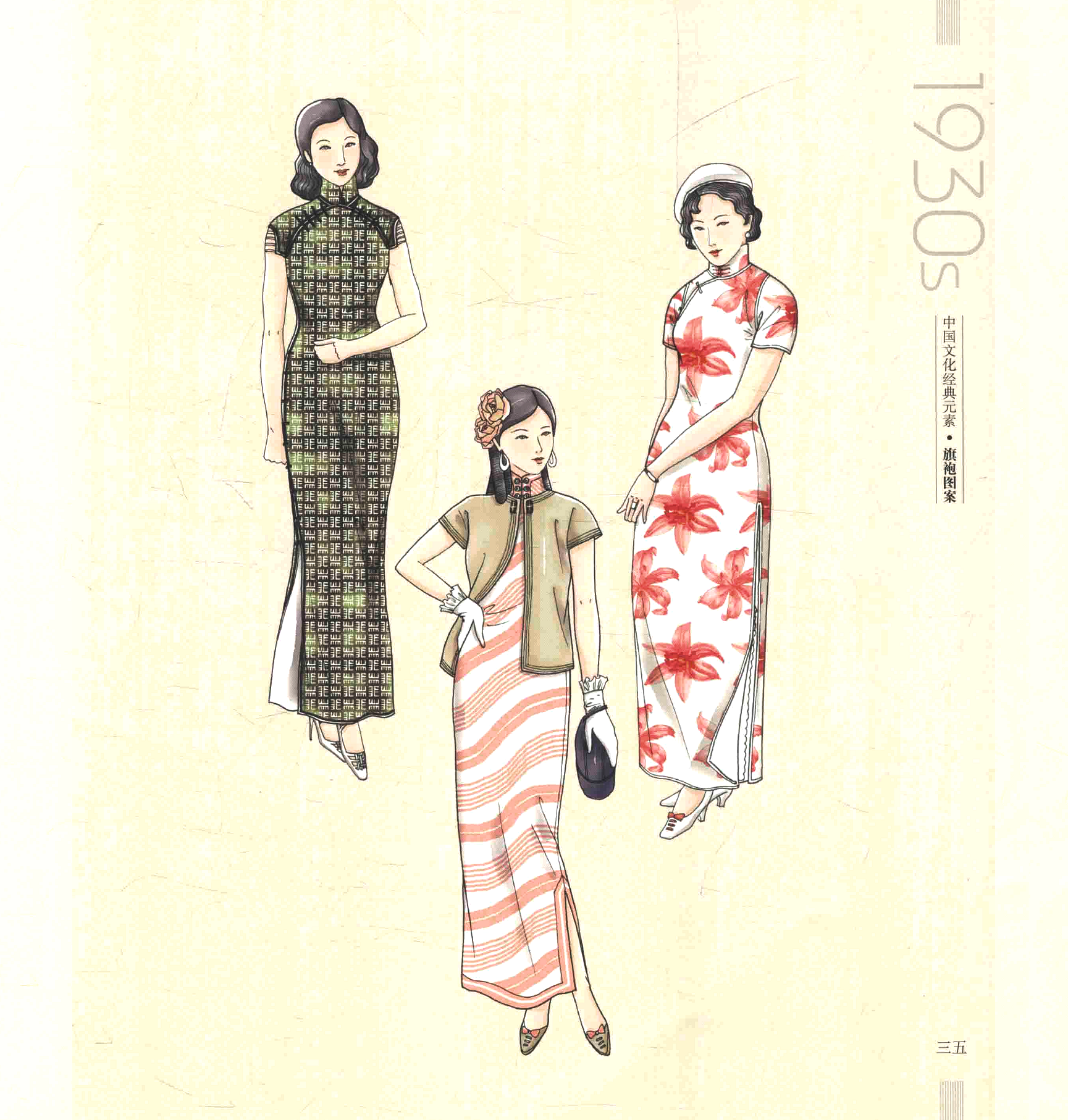 Вместе с общей вестернизацией и разнообразием дизайна ткани и узоры ципао 1930-х годов стали более новаторскими и своеобразными, с общей тенденцией к многообразию форм и богатству цвета. В ту эпоху популярны были цветочные и другие растительные мотивы, а также множество видов геометрических узоров.