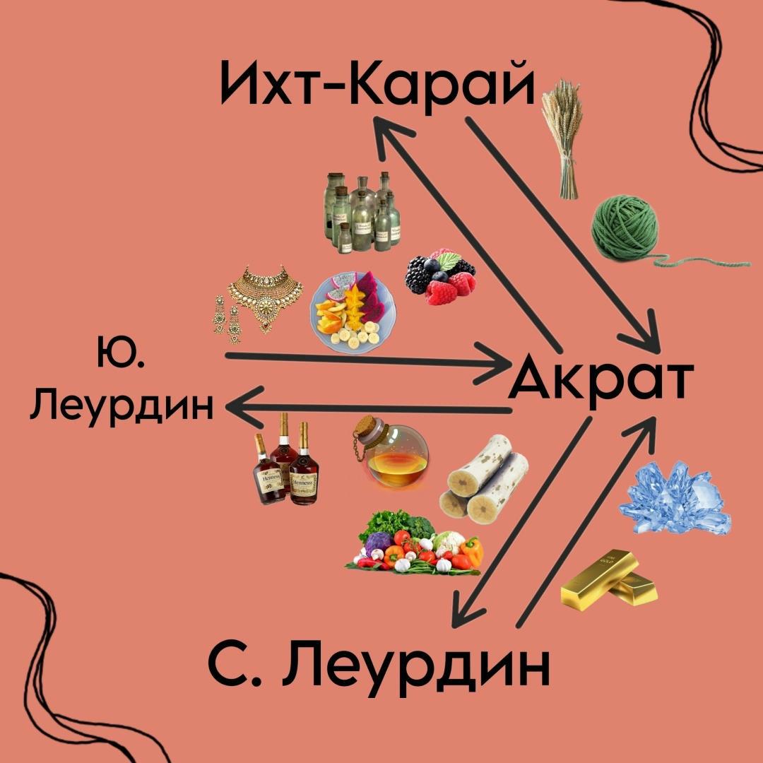Акрат экспортирует древесину в Северный Леурдин, а также большое количество овощной и фруктовой продукции, алкогольную продукцию, лечебные травы и эликсиры и в другие соседние страны. Импортируют в Акрат злаки, овечью шерсть/пряжу, глиняную посуду, оружие и др. из Ихт-Карая, семена и фрукты, украшения из Южного Леурдина, драгоценные камни и металлы из Северного Леурдина.