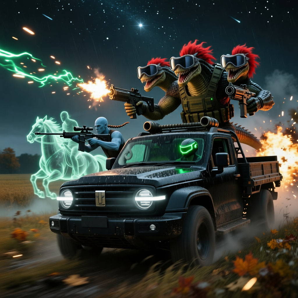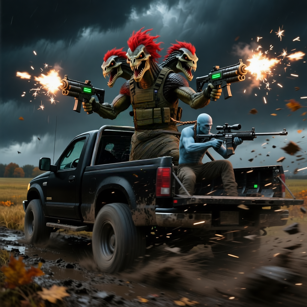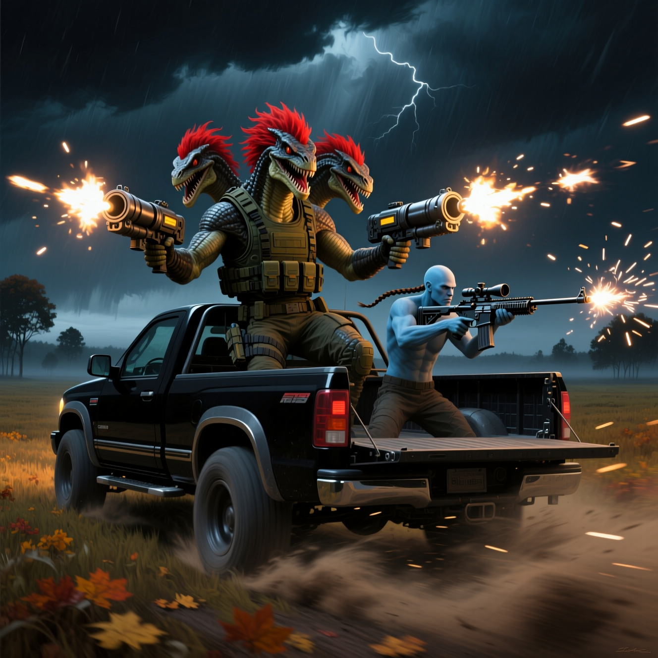 Автор: Михаил ПоляковНа открытом, модифицированном кузове, держась за специальные поручни, стояли двое. Справа, занимая почти полборта, возвышался Несси. На нём была не любимая клетчатая рубашка, а плотный стёганый жилет-разгрузка, увешанный магазинами-батареями. Его три головы в защитных очках смотрели в разные стороны, каждая была вовлечена в погоню. В могучих лапах он держал два устройства, похожих на гибрид крупнокалиберного револьвера — «Гром-2». Стандартный охотничий нейтрализатор, только увеличенный, с двойной системой охлаждения и энергоблоком на двадцать залпов. Обычный человек предпочёл бы держать такой двумя руками, но дракон лишь наслаждался тяжёлой мощью. Его хвост, жёстко упёртый в пол машины, работал как идеальный стабилизатор.