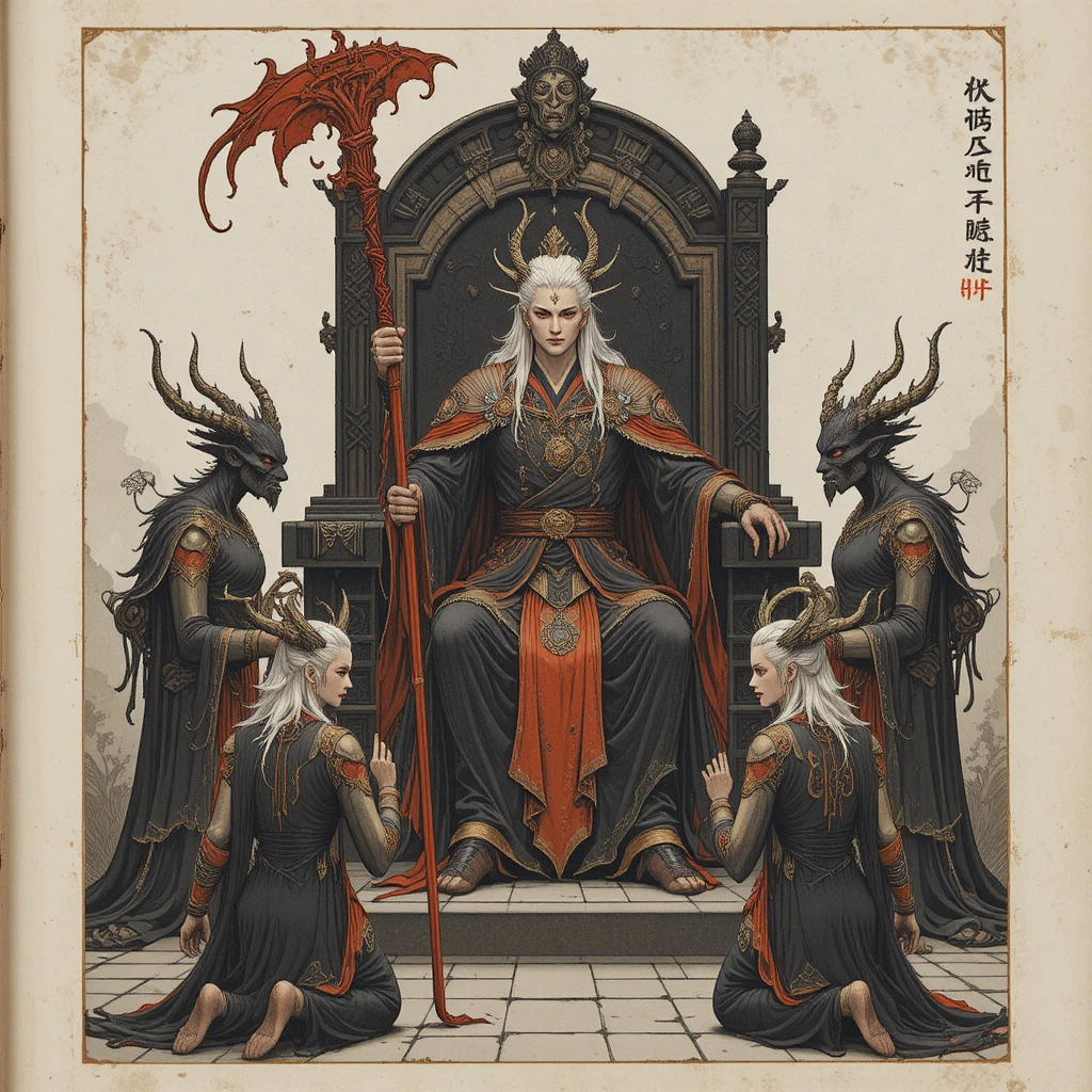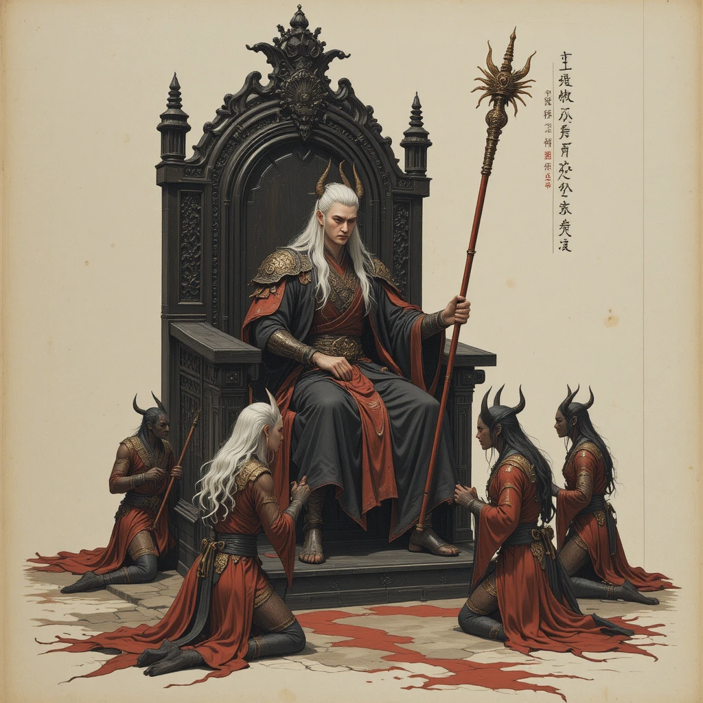 В таком стиле мне нейронка выдала два приемлемых изображения Короля Демонов на троне; первое соответствует стилю лучше, но лишняя кисть вызывает вопросы)