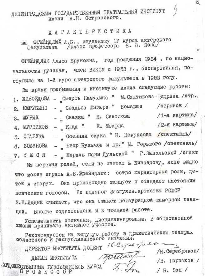 Отец отговорил: «Ты будешь как муха на куличе». В том смысле, что я слишком мелкая, чтобы петь в опере. Ещё он сказал: «Если ты всё-таки захочешь пойти в консерваторию, то сможешь иметь судьбу камерной певицы, не больше того. И там, кстати, сгодятся твои драматические способности. Ну или иди в театральный институт, раз тебе хочется осуществить эти свои страсти. Уж там-то пригодится и голос, и желание петь». Он уже был наслышан от преподавательницы нашего школьного драмкружка, с которой отец был знаком, потому что они вместе какое-то время работали в БДТ и даже дружили, что у меня есть способности. Я занималась там с шестого класса. Играла то старушек, то мужчин... Школы были женские и мужские, так что в драмкружке приходилось справляться только девчачьим составом. И когда, допустим, ставили «Женитьбу Бальзаминова», я играла Бальзаминова. На героиню я не тянула... Героиней у нас была очень красивая девочка Вероника Афанасьева...