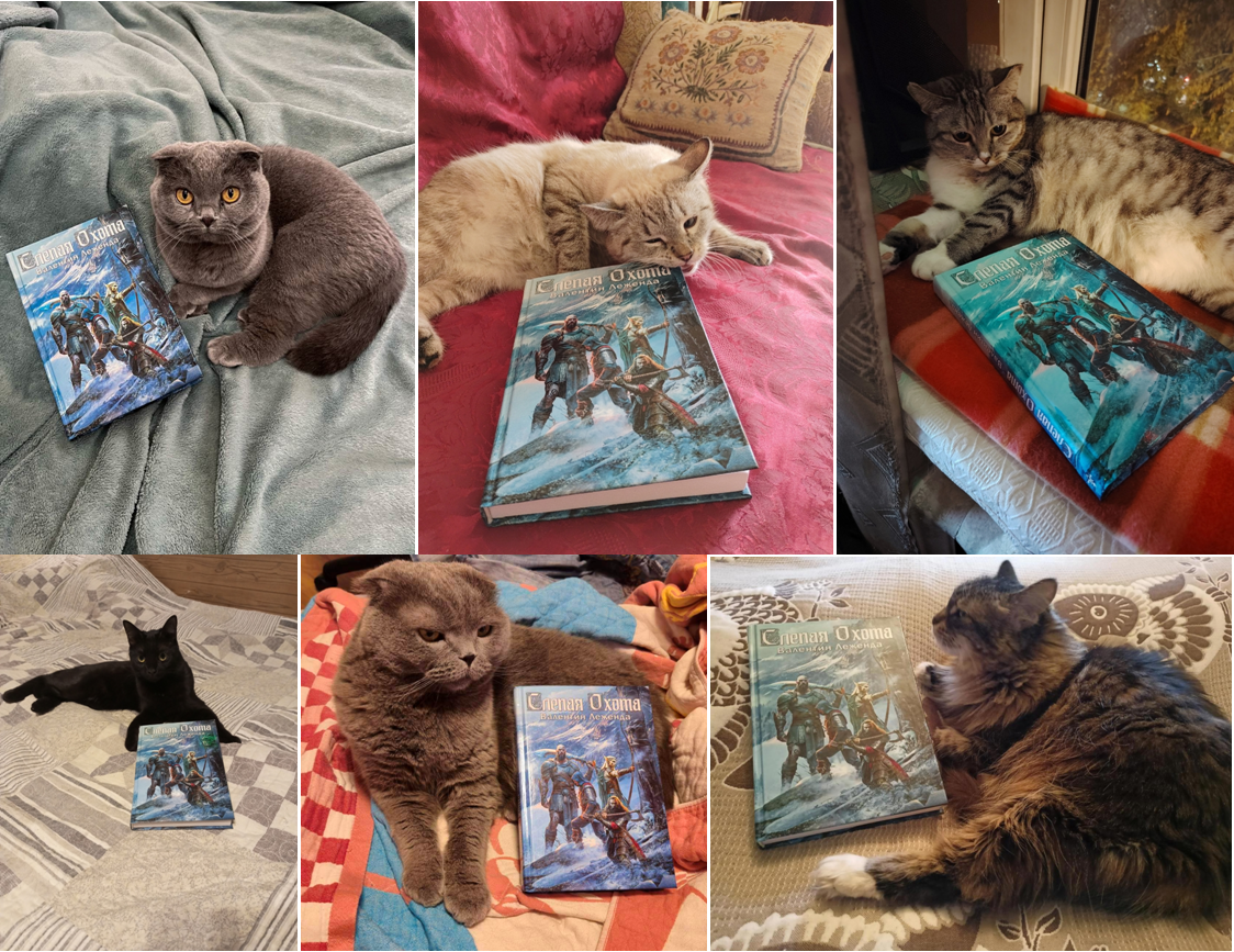 Автор: Валентин ЛежендаВот такую прелесть мне прислали на прошлой неделе из славного города Курск. Знакомьтесь это кошечка Плюша. В определённой степени меня теперь терзает некоторое чувство вины. Несчастное животное совсем обессилило, читая мой новый бумажный роман «Слепая Охота». Надеюсь, со стороны хозяев не было принуждения к этому делу (нет-нет, даже подумать такое страшно). В общем очередное чудесное пополнение моей фото коллекции. Чуть ниже Вы можете посмотреть на предыдущие экспонаты (в виде своеобразного коллажа). Насколько эффективная такая реклама сказать пока не могу. К какому кошачьему богу обратиться, тоже не знаю. Список ведь не так уж и велик. Может к Бастет?