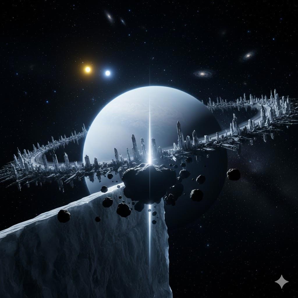 Свет от двух солнц пришёл со столь большого расстояния, что слился в один крохотный луч. Отразившись от отвесной ледяной стены, он упал на чёрную поверхность огромного астероида, намертво зажатого другими небесными телами. Кольцо из камня, замёрзшего метана и пыли, длиной более миллиона километров, вращалось вокруг белого ледяного гиганта. Сверкающие скалы возвышались на внутренней стороне, составляя бесконечный ряд плоских заострённых лезвий, обращённых к приютившей их планете.
