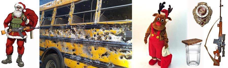 Первые пули поразили пулеметчиков, но бандиты были опытной публикой и быстро залегли,и сосредоточили огонь на автобусе. Дети, к счастью, сразу залегли (был увы кое какой опыт), и тут из боковой улицы выбежала непонятная группа, и развернувшись в цепь, ведя огонь на ходу, пошла в атаку. Мало того, что атакующие были в костюмах Санта Клаусов, в центре группы бежал огромный олень с пулеметом, причем, его оторванная голова болталась сзади.