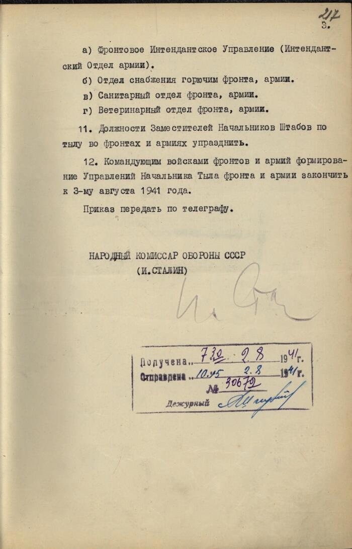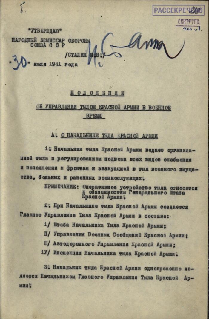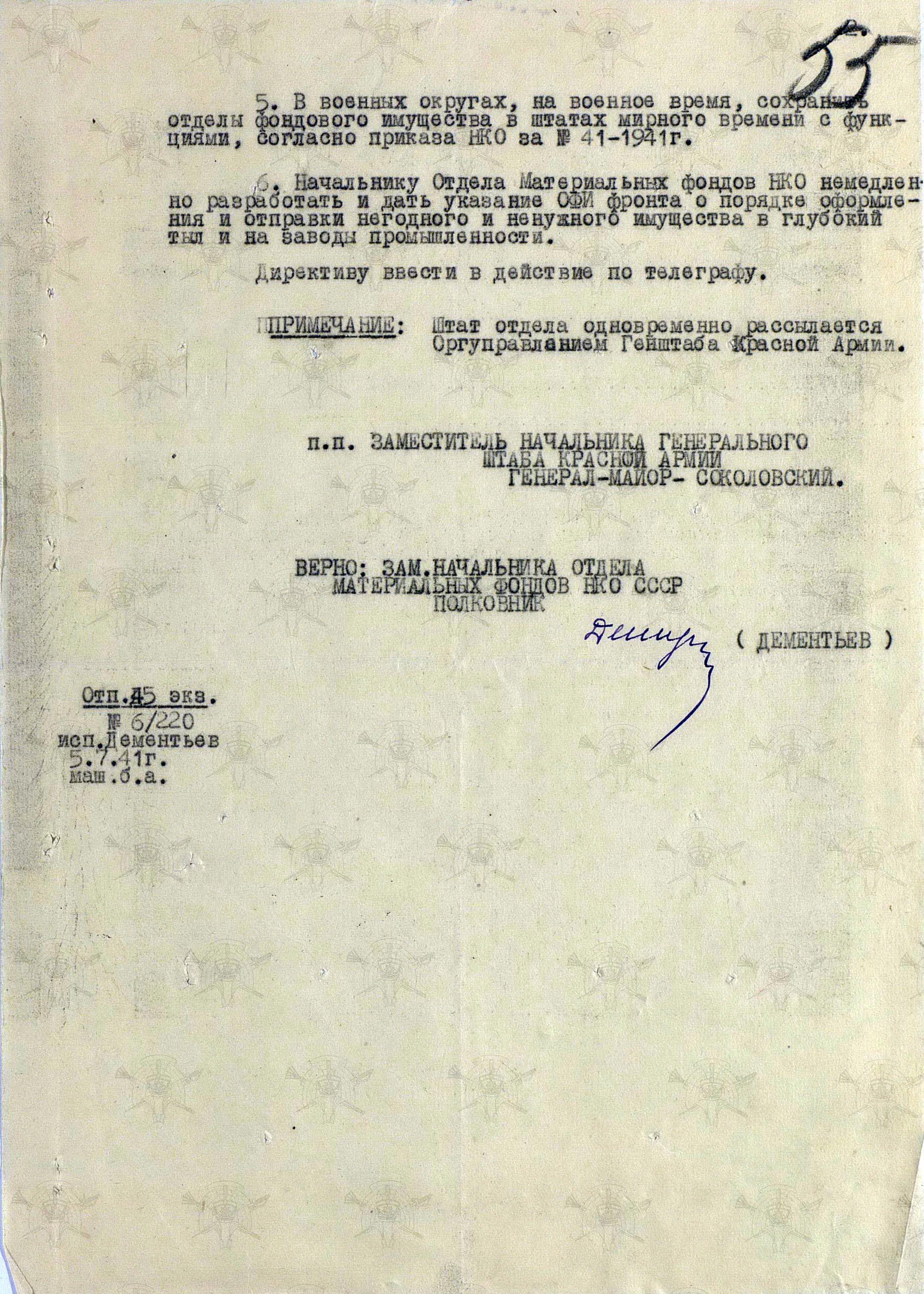 Вроде всё ясно и понятно. Так то оно так, да не совсем. 5 июля 1941 года, Генеральный штаб Красной Армии издал указание 563681с, в соответствии с которыми каждый штаб фронта обязался сформировать отдел фондового имущества фронта. Отдел подчинялся заместителям начальников фронтов по тылу. Этим же указанием определялись обязанности отделов фондового имущества, в том числе и по организации транспортного обеспечения.