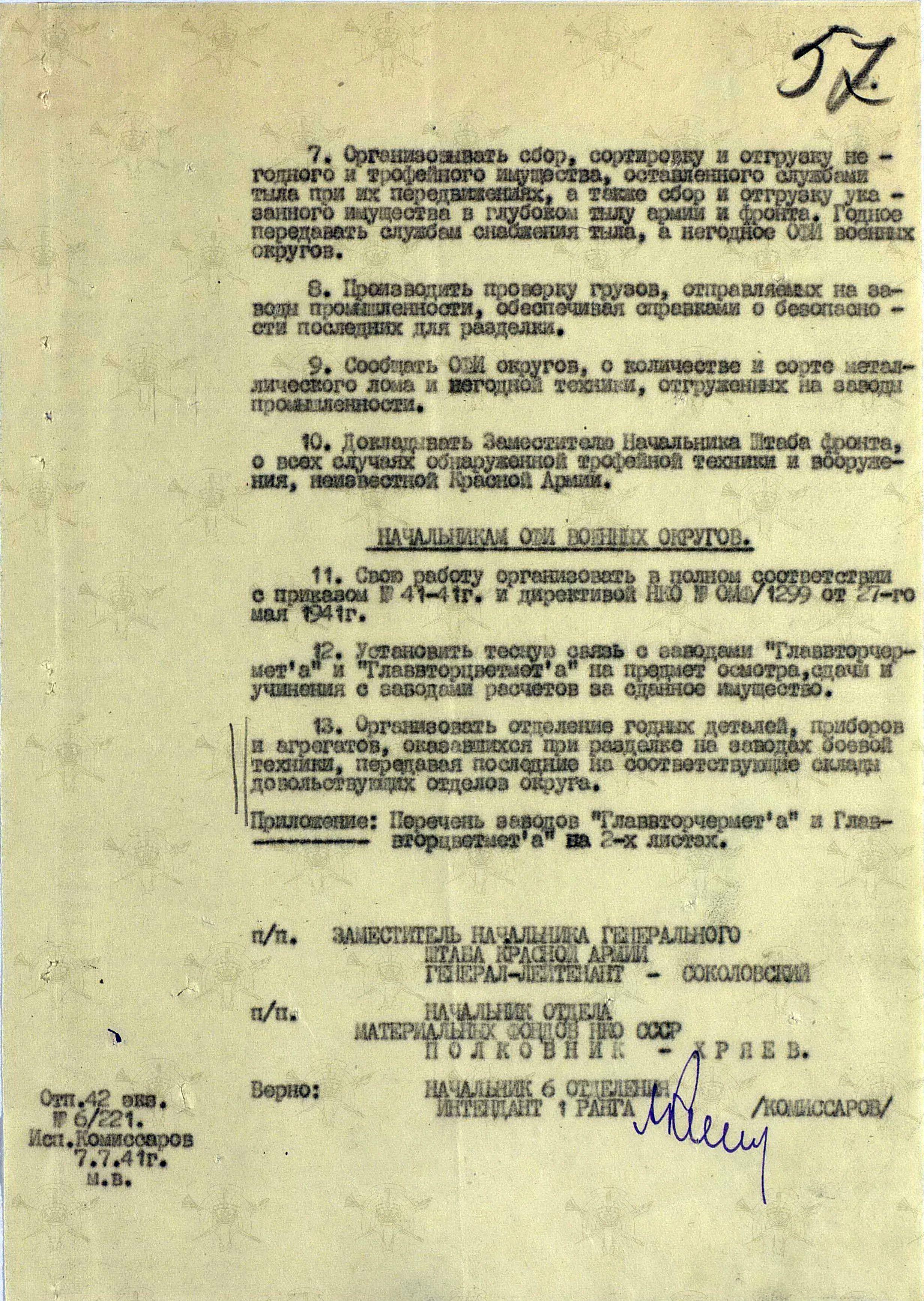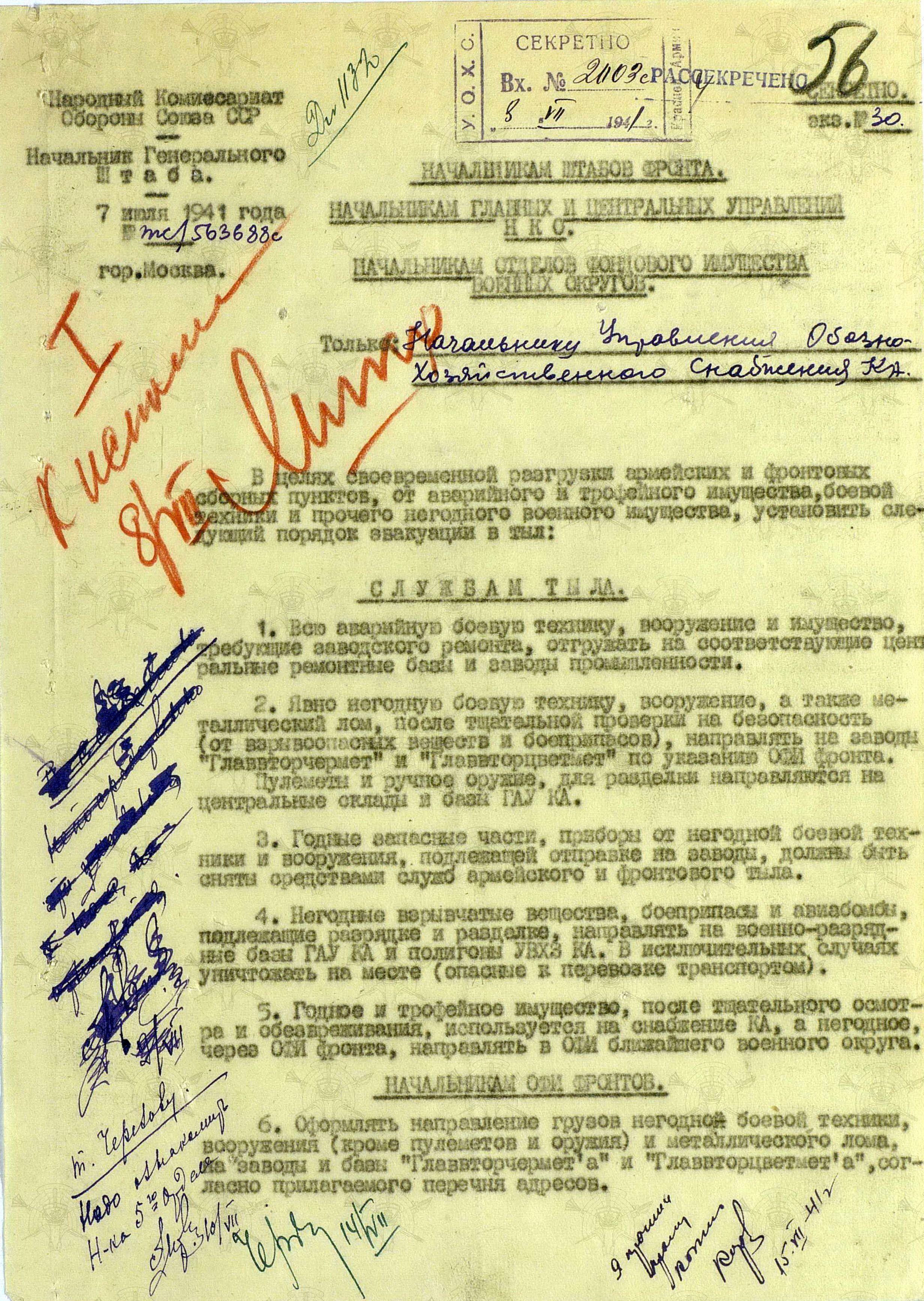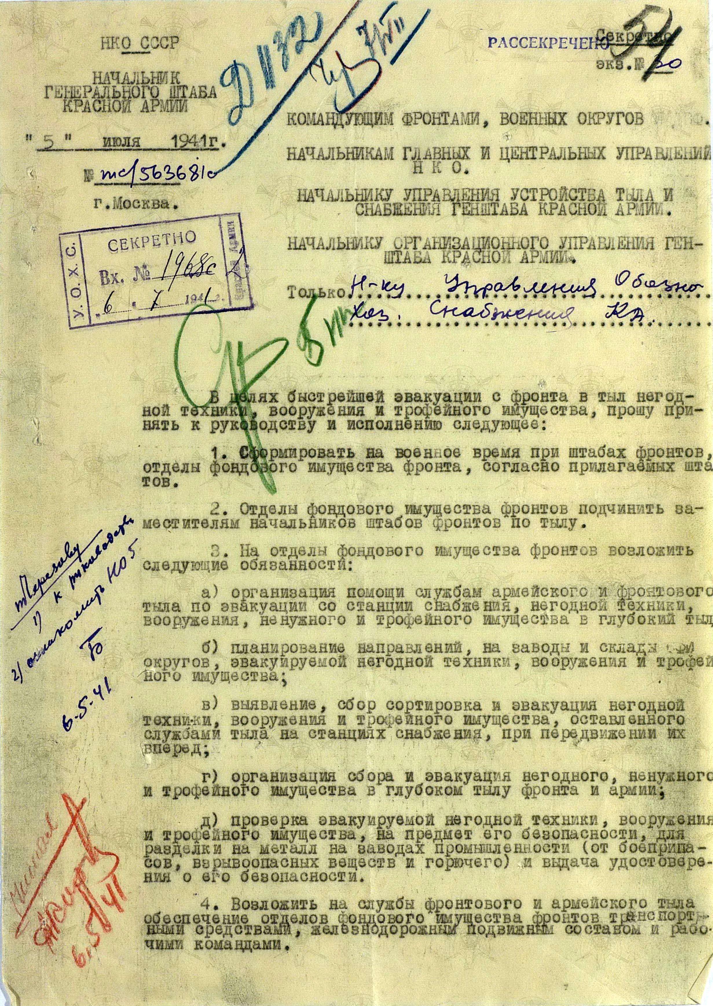 7 июля 1941 г. Генштаб КА издаёт ещё одно указание, № 563688с, которым определяет порядок эвакуации в тыл аварийного, трофейного, негодного имущества, вооружения и военной техники. Задачи по исполнению ставятся начальникам служб тыла, начальникам отделов фондового имущества фронтов и военных округов.
