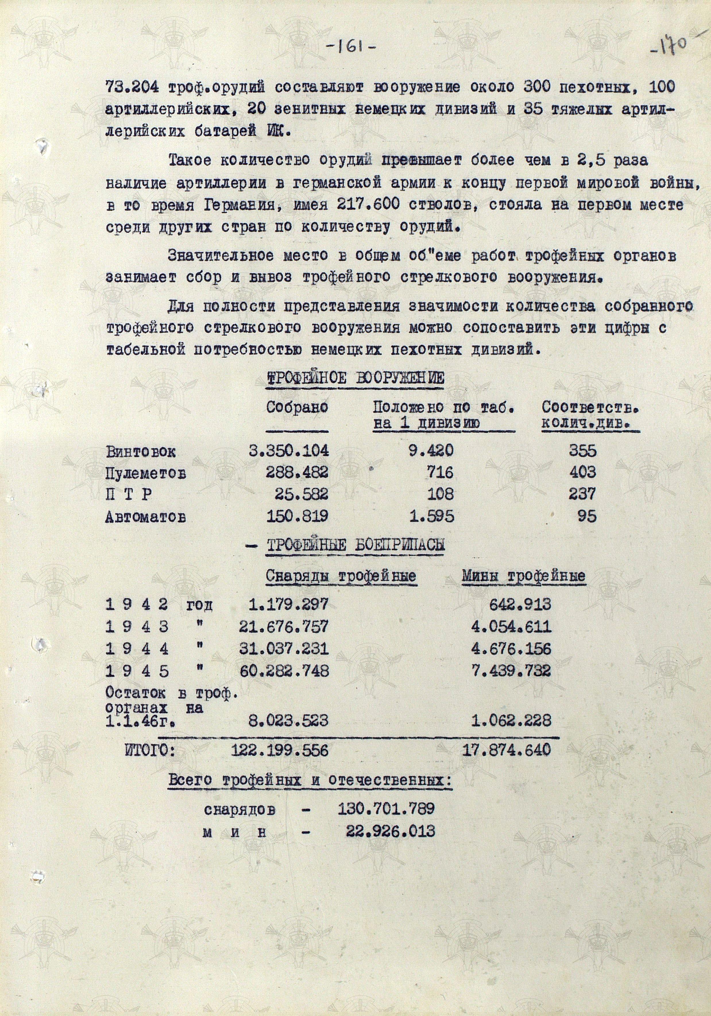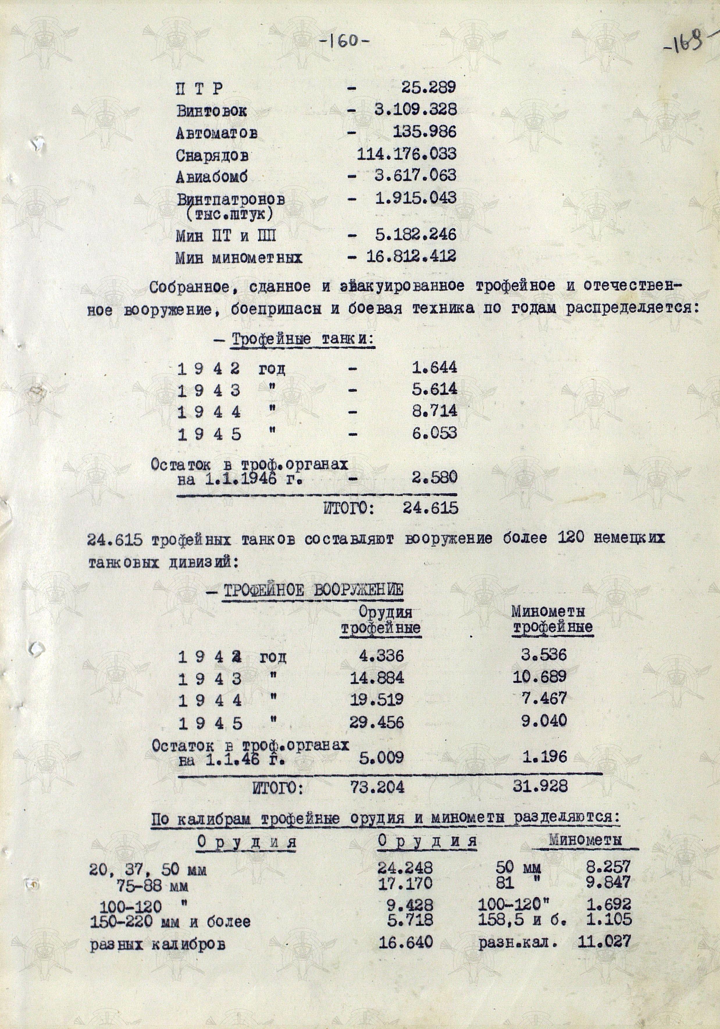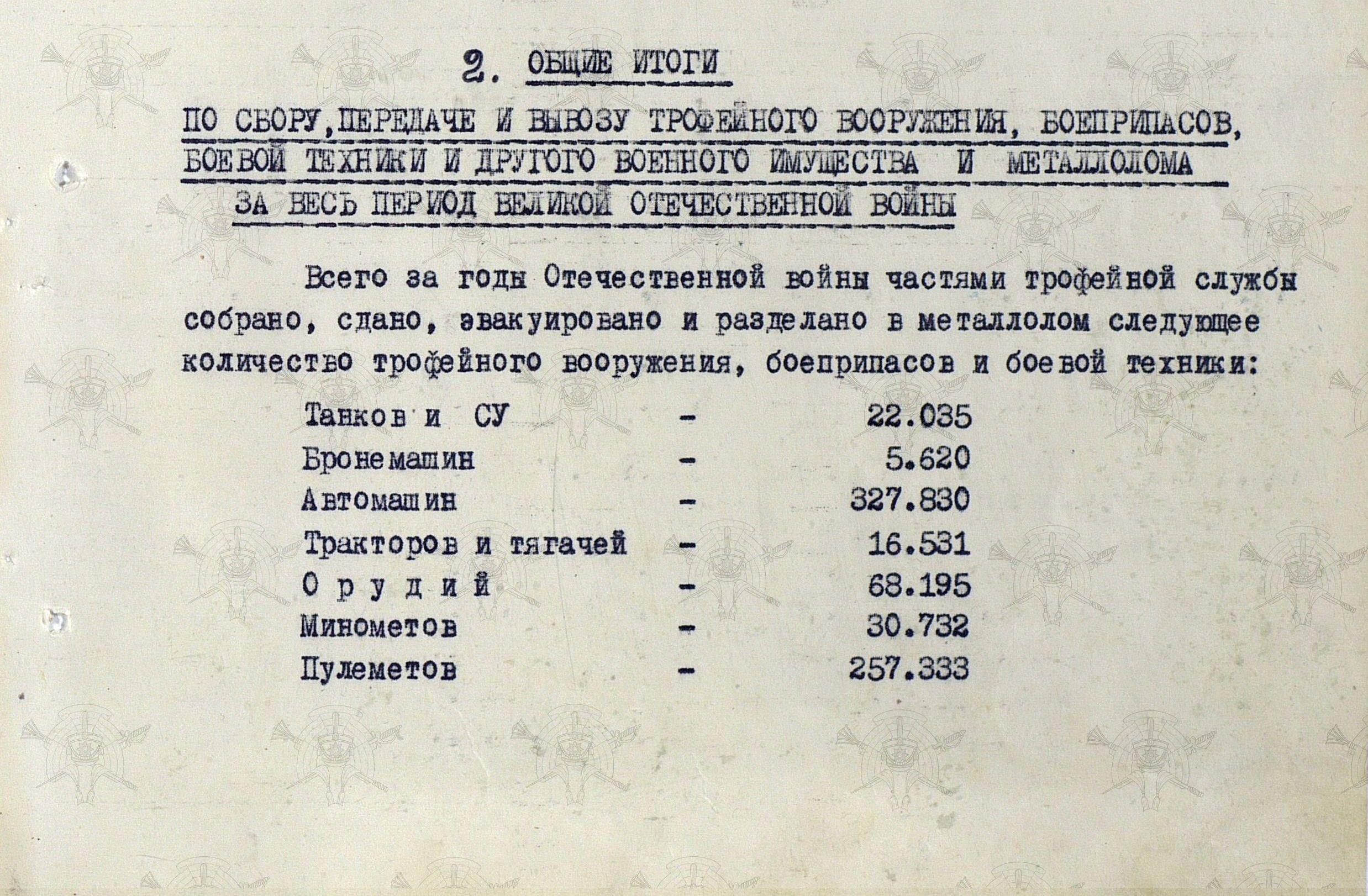 Ответ нашёлся в заключительной части отчёта. В итоговые данные не вошли сведения по вооружению, военной технике и другим материальным средствам, собранным после окончания Великой Отечественной войны и числящихся на остатках в трофейных органах по состоянию на 1.1. 1946 г.