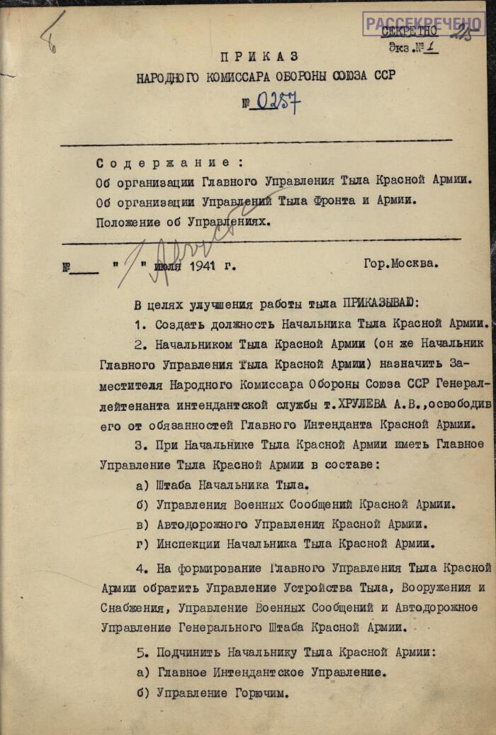Откуда тогда взялся август? Так как авторы статей упоминают коренную реорганизацию тыла Красной Армии, то скорее всего, они имеют ввиду Приказ Наркома обороны СССР № 0257 от 1.08.21941 г. Действительно, в нём, помимо прочих, Начальнику Тыла Красной армии, начальникам тыла фронтов и армий ставится задача по организации эвакуации. Для начальников тыла фронтов и армий она звучит так: «руководство эвакуацией из армейского и фронтового тыла больных и раненых, а также трофейного и негодного военного имущества».
