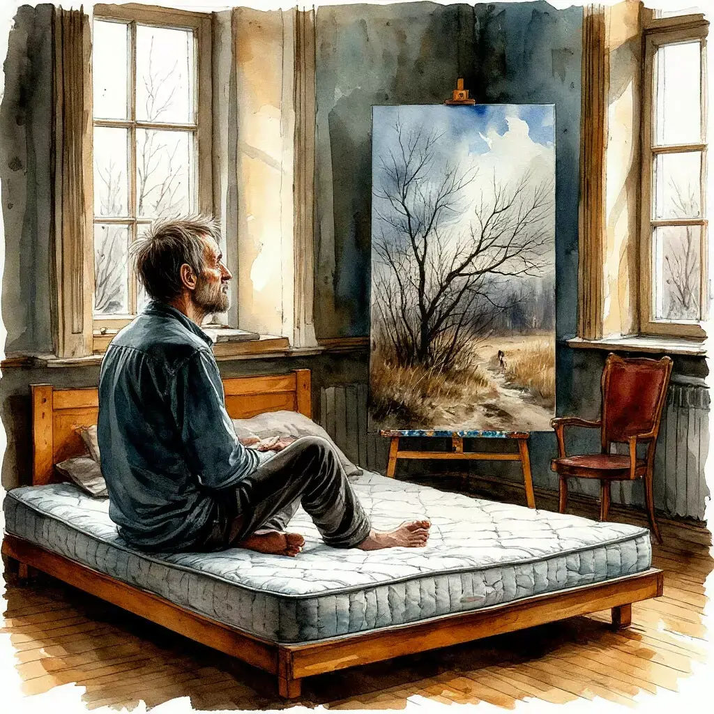 Худой мужчина с посеребренной щетиной сидит на бугристом матрасе в углу маленькой комнаты. Смятое желтое одеяло колет его голые ступни верблюжьей шерстью. Свет изредка заглядывает в окно из двора-колодца и почти не разгоняет сумерки, затянувшие скудную мебель в тусклую шаль. Шкаф цвета каштана и круглый стол - единственные соседи подражателя кровати. У подоконника на стуле стоит картина, а рядом на полу - плоская коробка с бурой тряпкой внутри. Пыльные лучи солнца случайно задевают холст и оживляют пейзаж ранней весны. Мужчина, уткнувшись подбородком в угол коленей, смотрит с блаженной улыбкой на творение художника и переносится в другой мир.
