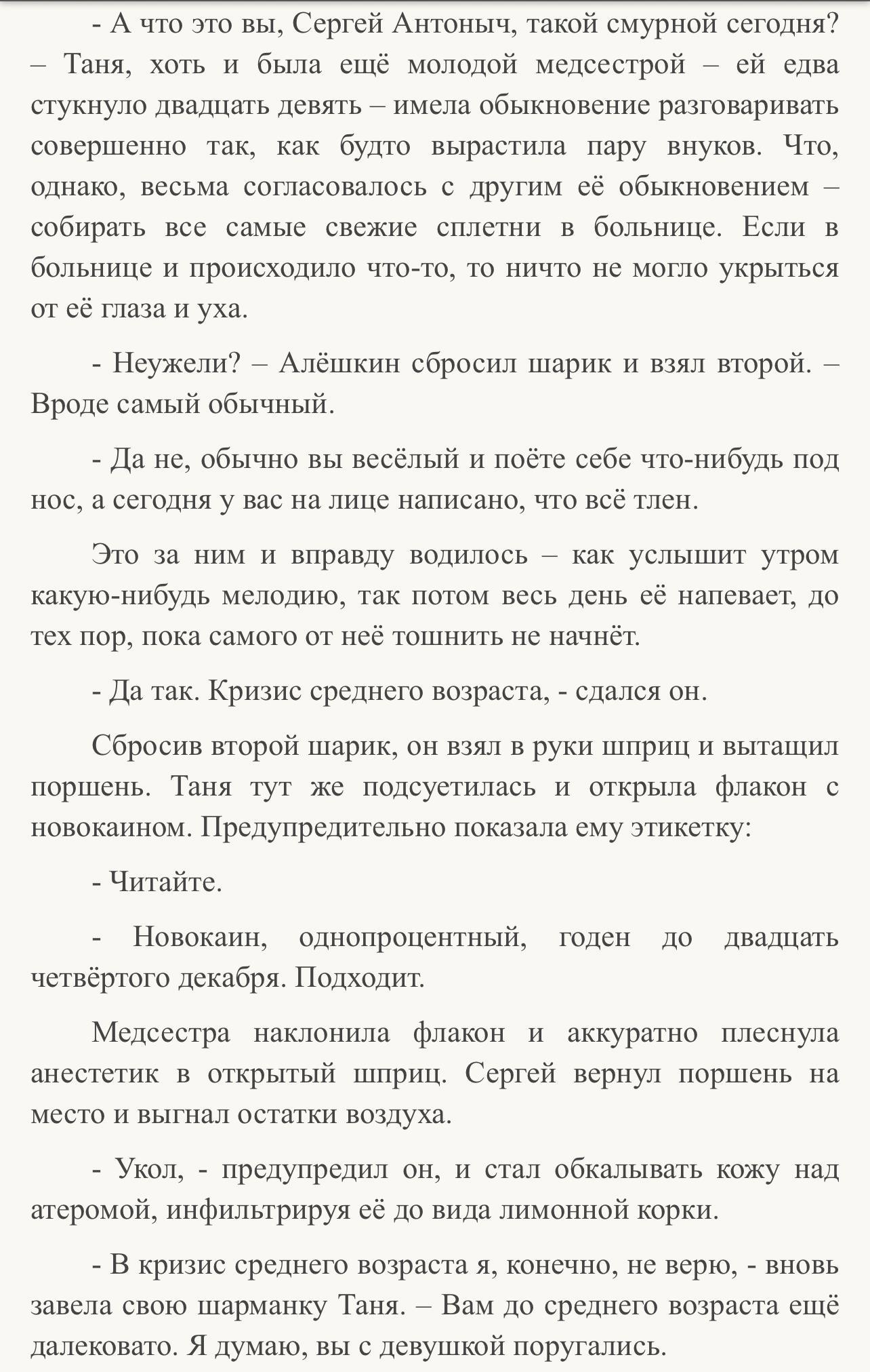 как критик - которым я не являюсь и не буду - наверно, могла бы найти огрехи. и, возможно, кто-то найдет. но докапываться специально не хочу. да - далеко не каждый день будет настроение читать производственный роман о хирургах. да, если главной линии не появится, а будут и дальше разрозненные сценки из приемов и кулуаров ординаторских и очередей в буфете, возможно, мне надоест. но пока это мило. и интересно, словно я сама снова в неотложке после кашля кровью сижу и в передышке наблюдаю за происходящими волшебными действами: