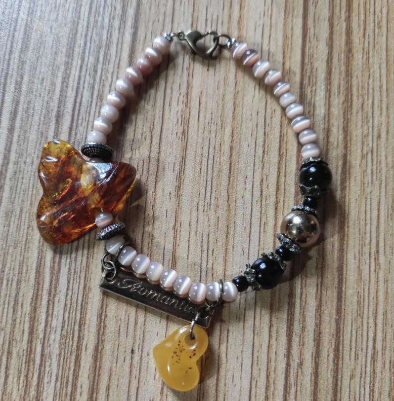 Янтарь, кошичкин глаз, агаты, пластиковая золотая бусина.