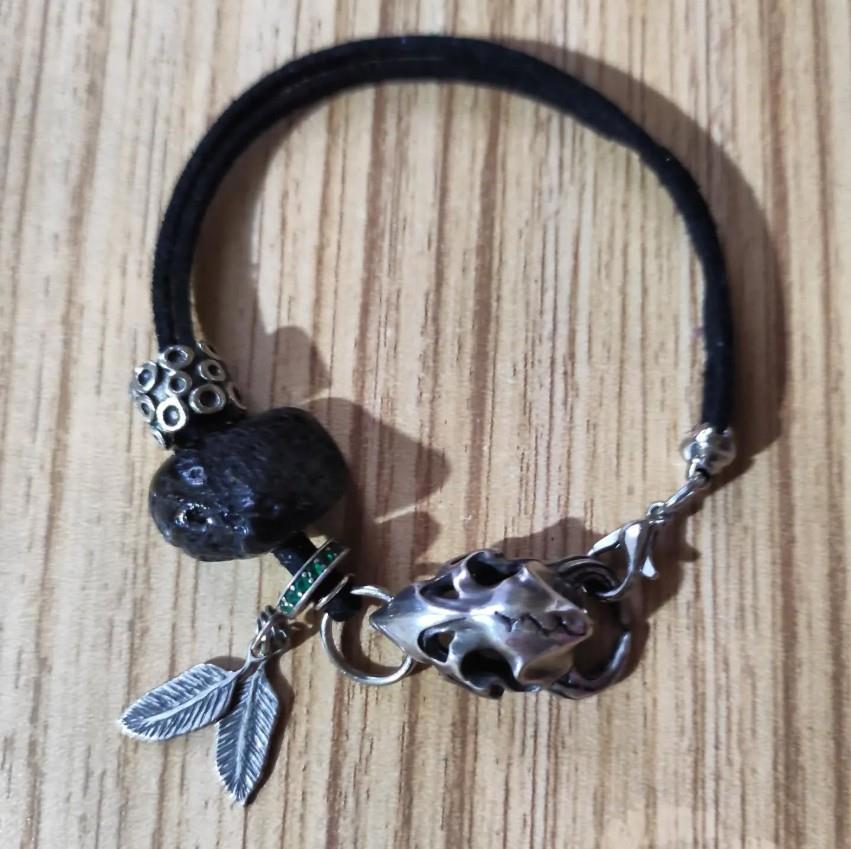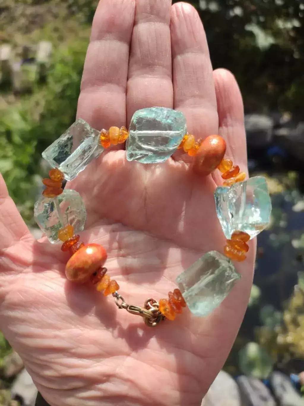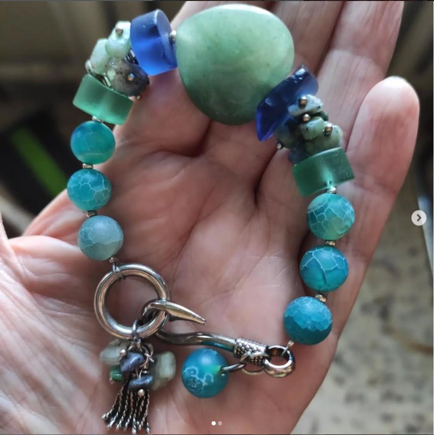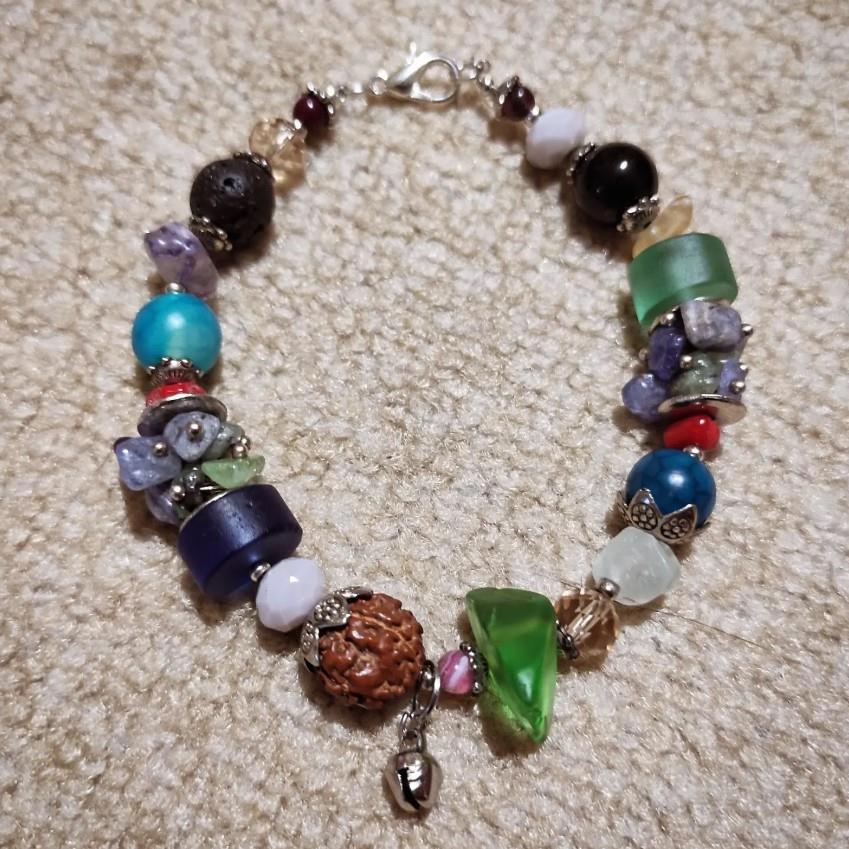 Мой любимец, под настроение собранный для себя. Лава, агаты, морское стекло, турмалинчики, кварц, аметист, флюорит, коралл, хрусталь и какой-то орешек ))