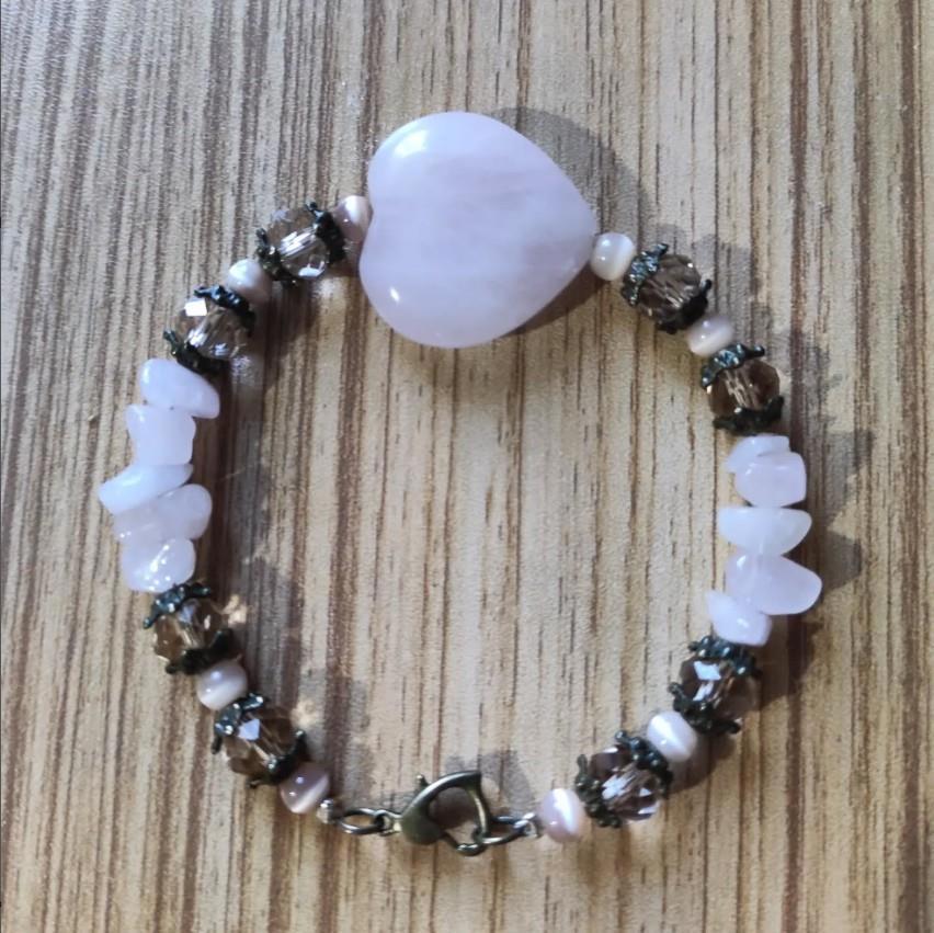 Этот для любимой снохи делала. Девушка она у нас нежная, хотя и настоящий полковник )) Кварц розовый, хрусталь, кошачий глаз.