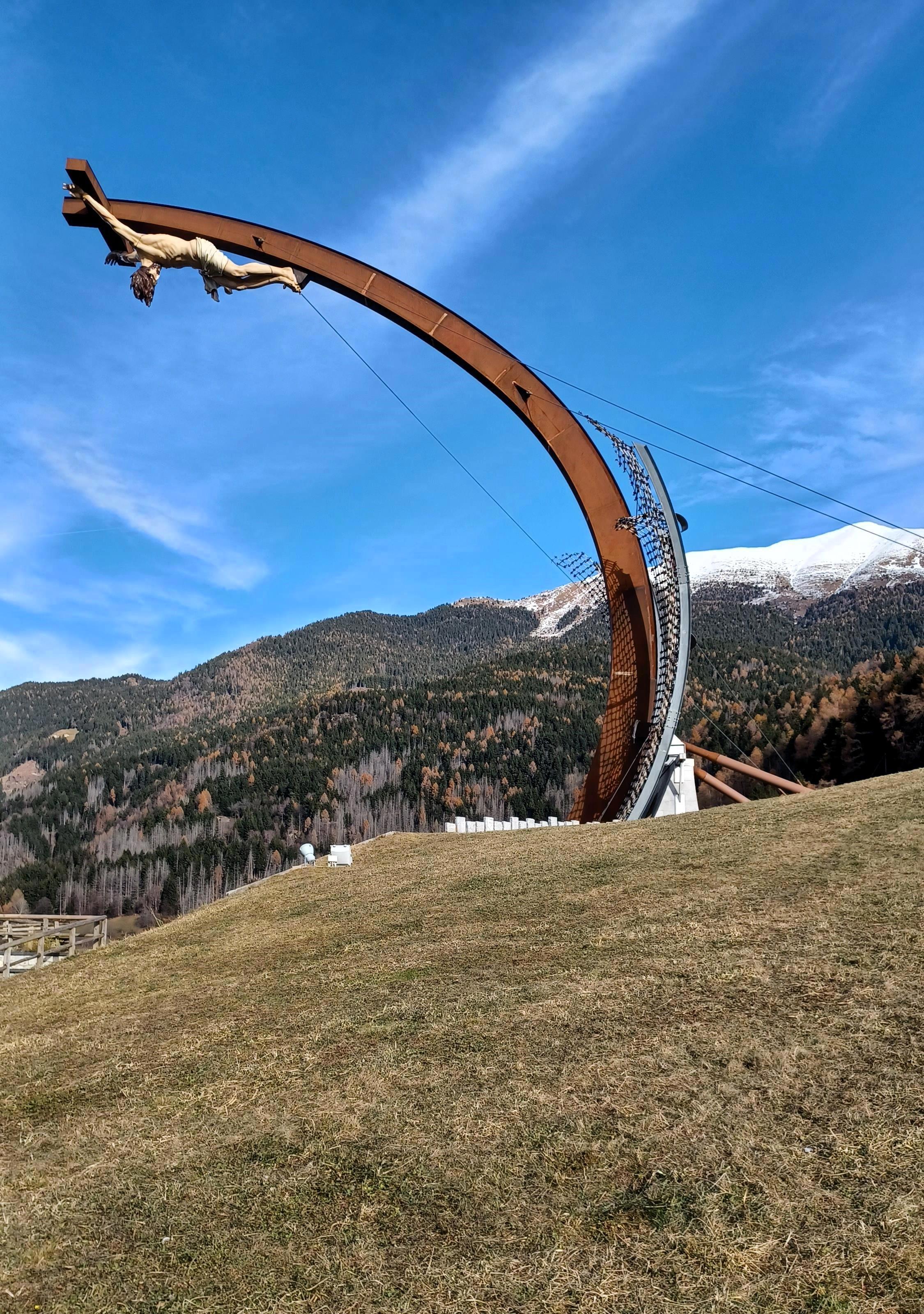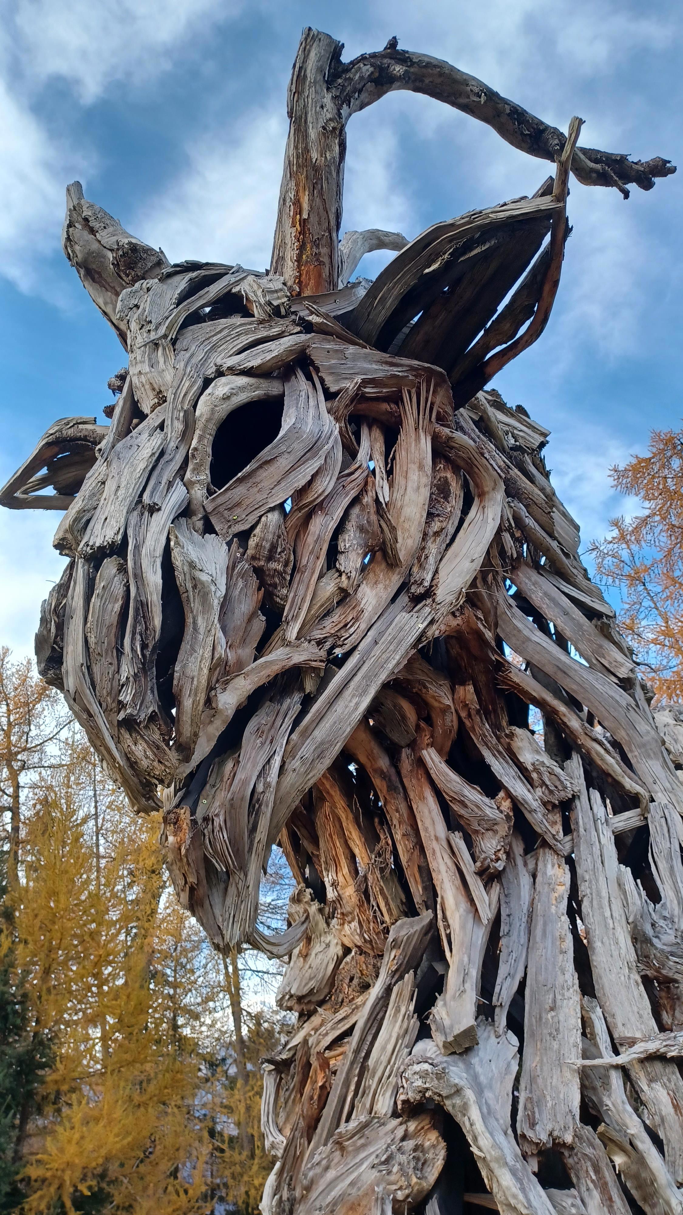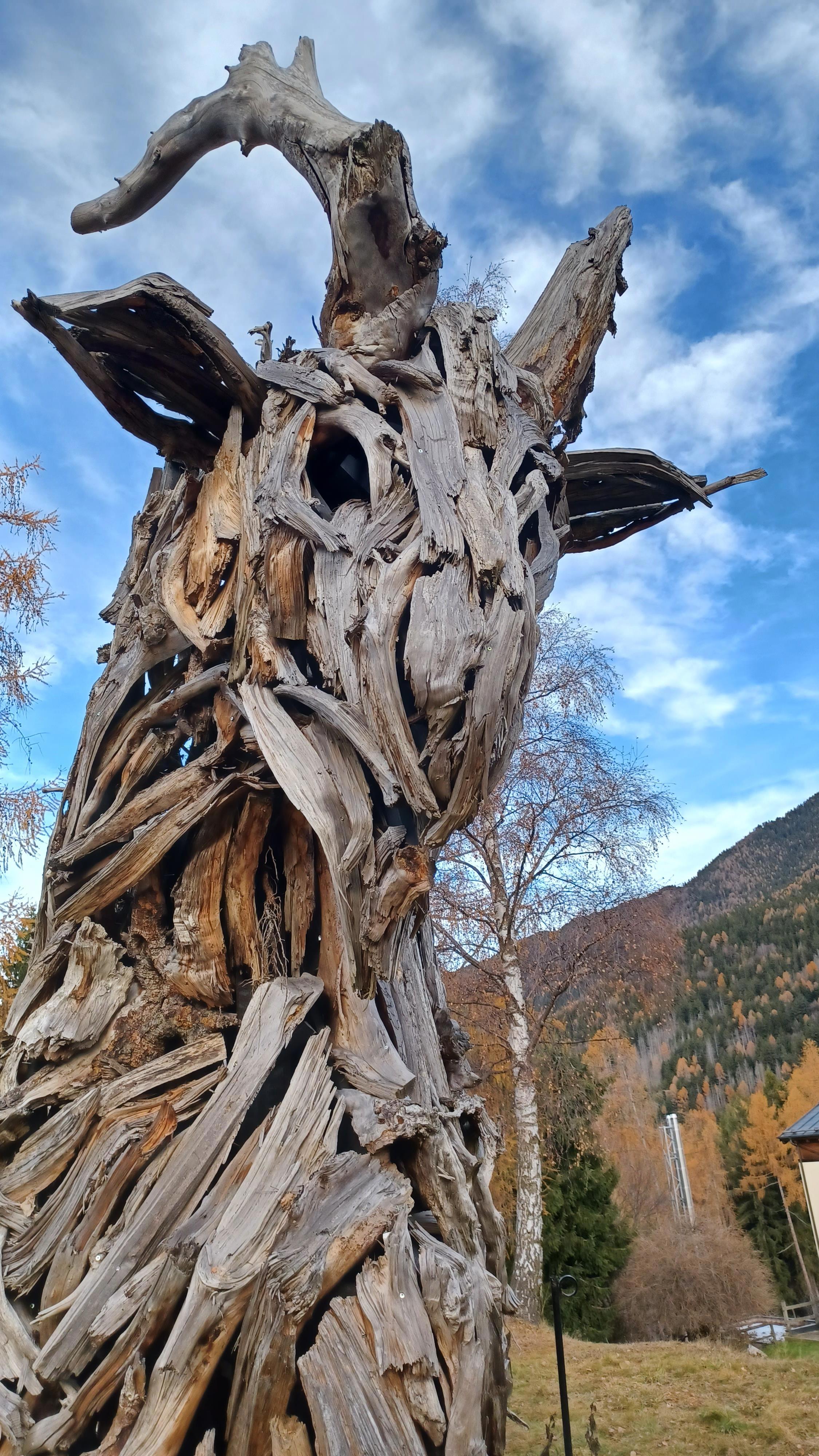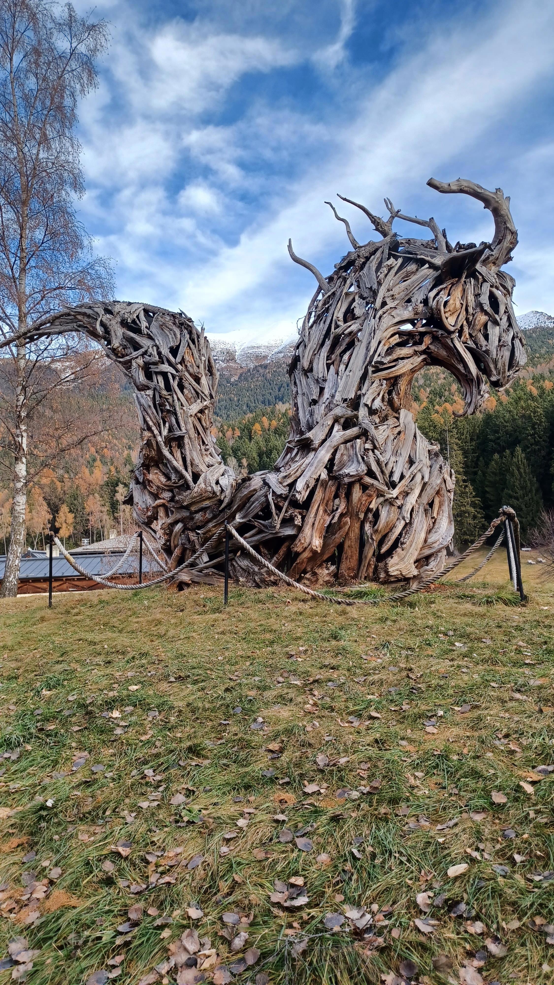Скульптор Marco Martalar. Все его произведения называются чего-то там Вайя, можно посмотреть в интернете другие. Он использует части упавших деревьев, а название дано в честь эпического шторма, который обрушился на север Италии осенью 2018 года, когда ветер достигал 200 километров в час и повалил более 18 000 деревьев.