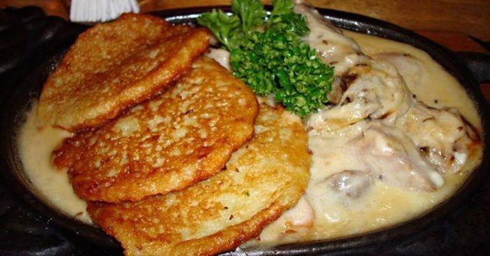 — Отлично. Гляжу, фарша вы приготовили многовато. Можно ещё и колдуны приготовить. Кажется, выходит по три драника сразу на сковороде. Отделяем немного фарша, добавляем половину лука, вы же взяли большую луковицу. Солим и перемешиваем. Наливаете тесто, как для драников, кладёте фарш в центр лепёшкой, сверху тестом закрываете. И медленно обжариваете с двух сторон. Потом на работу возьмёте на обед. Это бонусное блюдо на сегодня. Главное, мачанка с драниками.