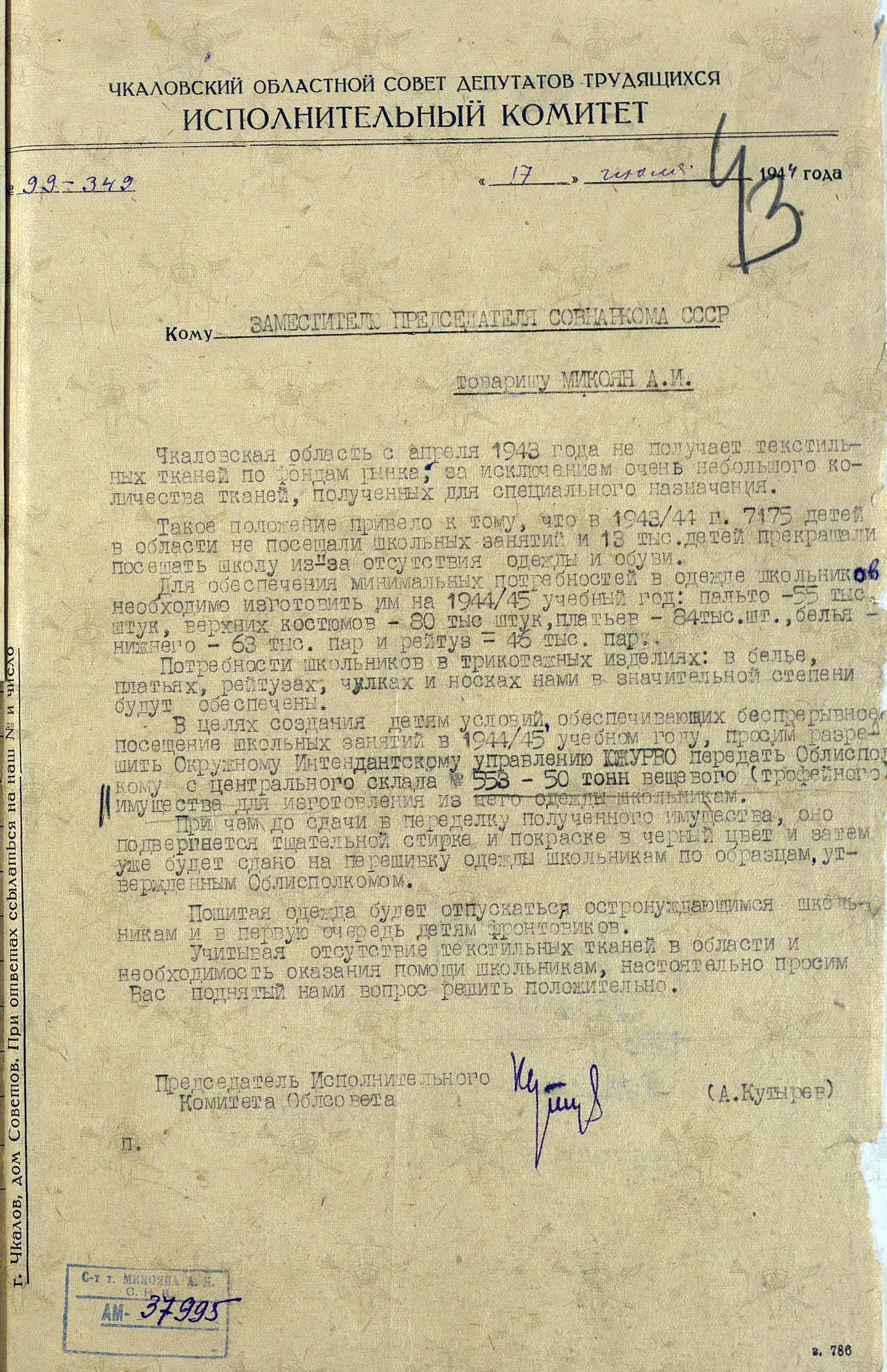 Меня уже несколько раз спрашивали о том, как использовалось трофейное обмундирование, и я неизменно отвечаю, что в том числе и для изготовления школьной одежды. Основанием для подобного утверждения явилось письмо Председателя Исполнительного Комитета Облсовета Чкаловской (в настоящее время - Оренбургской) области А. Кутырева, на имя Заместителя Председателя Совнаркома СССР А.И. Микояна.